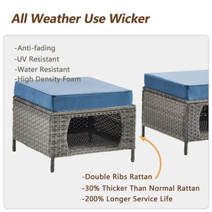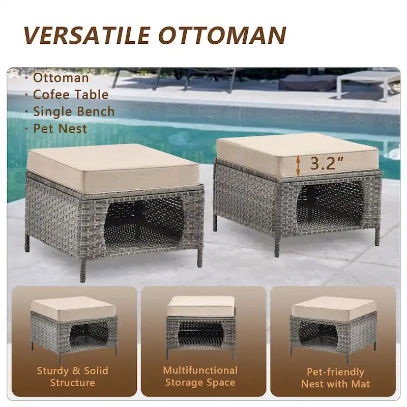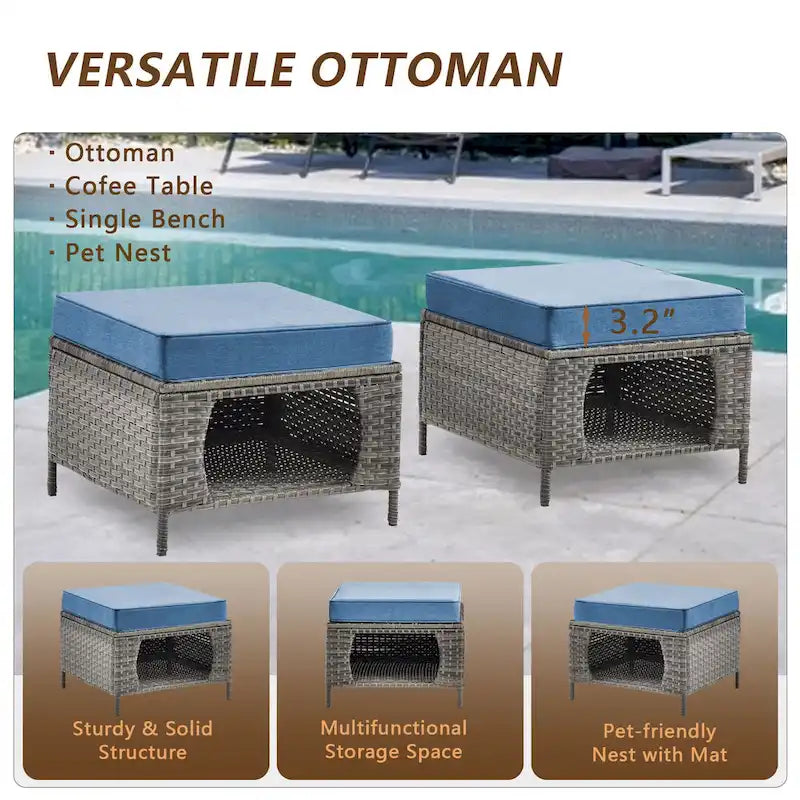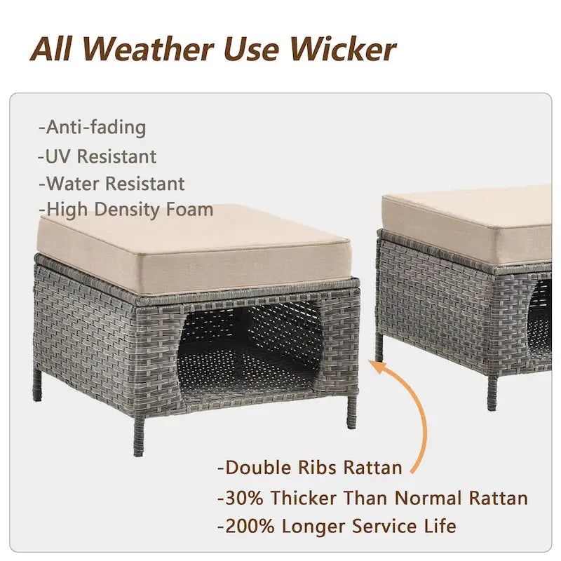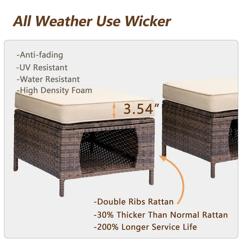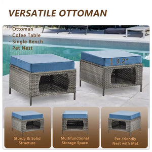 Xingzjojor wicker patio furniture set bring you a better outdoor experience. Wicker Ottoman with cushion can be used as a cofee table, seat or pet nest. More surprise is its hollowed-out design makes it can storage toys, pillows and blankets, also it can be used as a pet house for cats and small dogs. Great for multi-pet households. Furniture cushion is made of polyester or olefin material, thick sponge seat cushions make outdoor space more comfortable. All the furniture is handwoven all-weather resin wicker, powder-coated steel frames to ensure comfort and durability, it is also water resistant to UV protectionas well as the convenience of easy assembly.