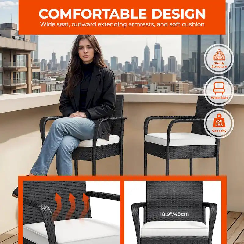 - Featuring a slightly-slanted backrest and built-in footrest, the outdoor wicker chairs will be more comfortable for your body. There are ergonomic and curved, smooth arms with an extra wide seat for enjoying a comfortable and relaxed patio life.