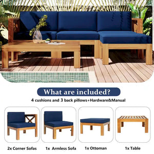 Premium Hardwood Frame: This outdoor patio seating group is crafted with acacia wood, creating a naturally fine texture and a charming aesthetic. With this material, the set is designed for longevity because the wood is durable, sturdy, and withstands climatic variations well.