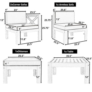 5 Pieces Corner Design Patio Set: This sectional seating group comes with two corner sofas, one armless sofa, one ottoman, one tea table, 4 cushions, and 3 back pillows. Featuring wooden X-back frames and classical beige cushions, this set brings a graceful look to any outdoor space.