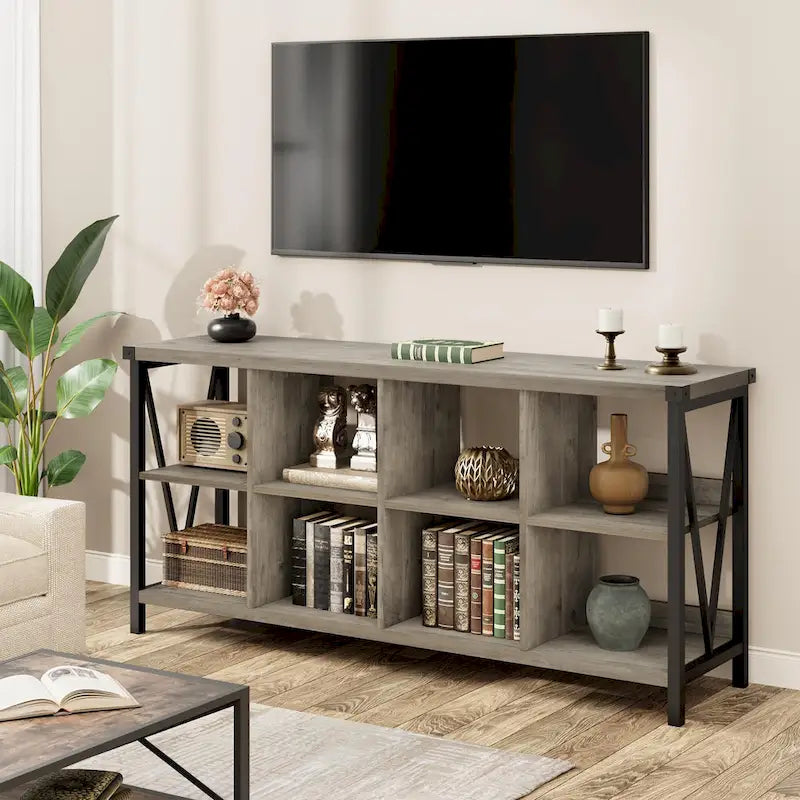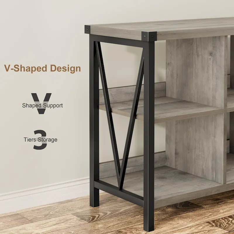 8-Cube Storage BookshelfThis entryway console features eight generously sized cubbies (14.2L11.8H13.4D), offering abundant space for books, decor, and daily essentials while maintaining living room/entryway organizationStabilizing V-Shape ArchitectureThe low-profile bookcase's distinctive V-shaped base combines modern aesthetics with enhanced structural stability. Its 3.1-high semi-enclosed back panel secures contents while complementing contemporary interiorsIndustrial-Grade ConstructionEngineered with a multi-process forged metal frame and high-pressure MDF panels, this rustic console withstands heavy daily use (200 lb capacity). Features waterproof corrosion-resistant surfaces maintainable with simple wipingOptimized Dimensions & Construction62.0L13.4W30.1H with 1.2-thick top/base shelves and 0.6-thick middle partitions. Functions seamlessly as TV stand, bookcase, or entryway organizerVersatile Space Solution Adaptable as sofa table, hallway console, or transitional furniture piece. Child-safe low-profile design grows with families from childhood through adulthood