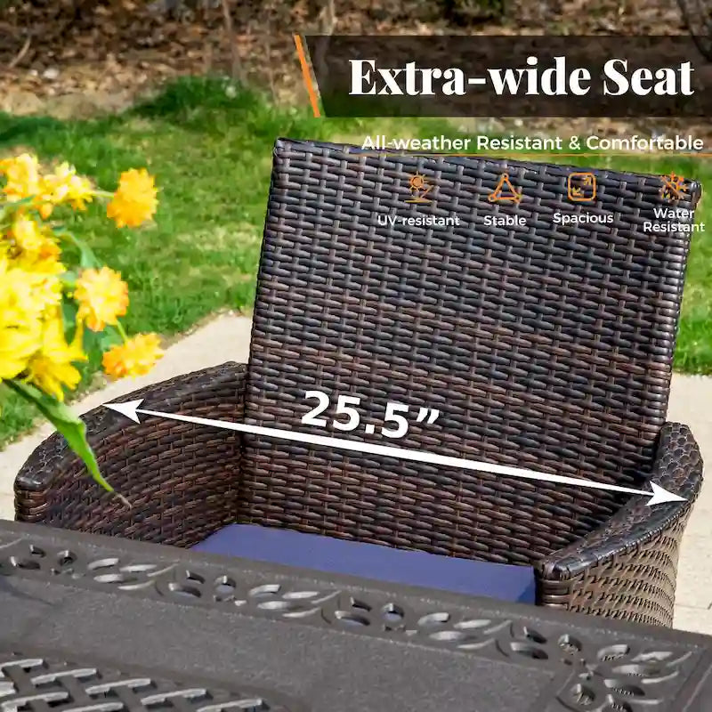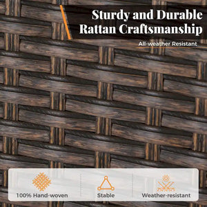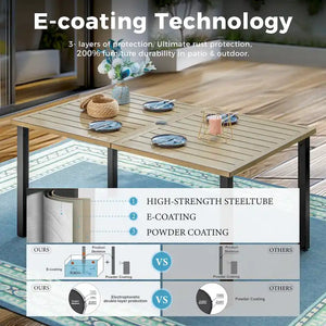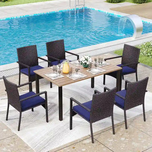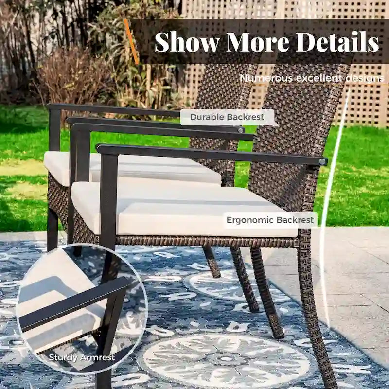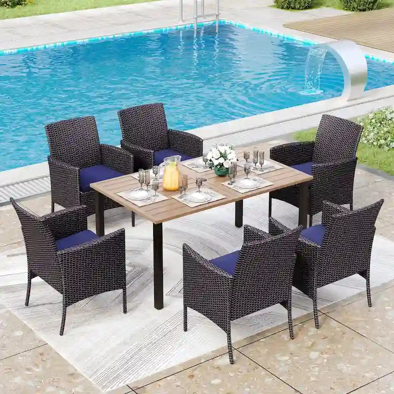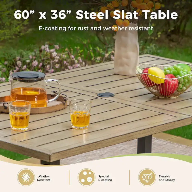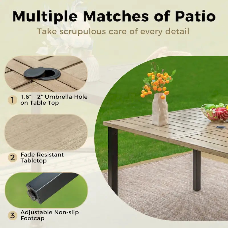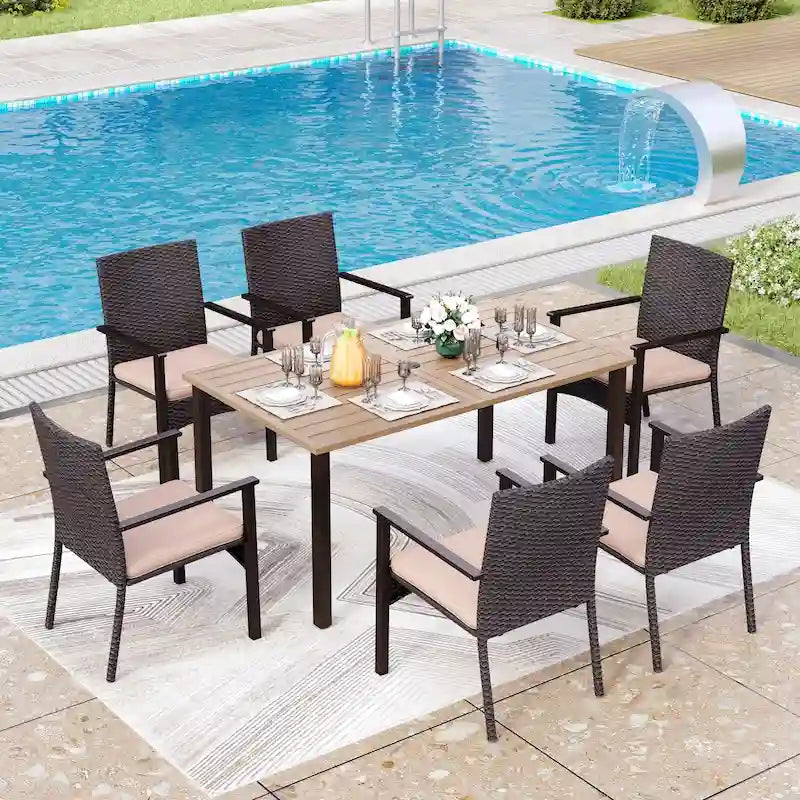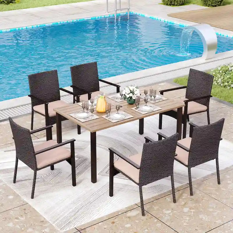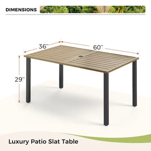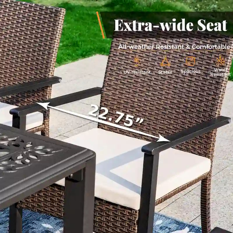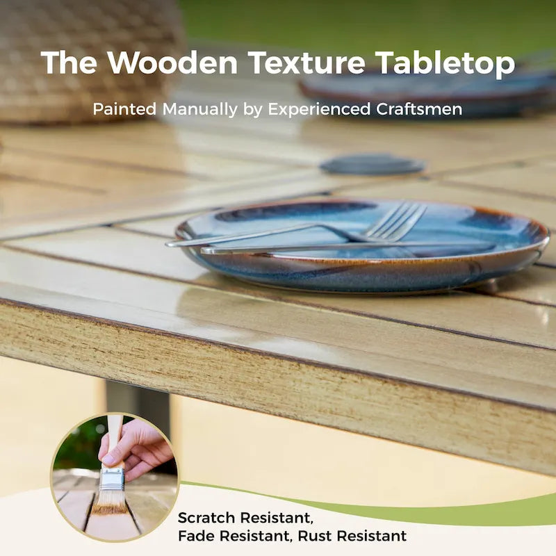 Update your backyard or porch with inviting modern patio dining furniture. Effortlessly accommodate the needs of your guests while creating the perfect outdoor patio dining sets. Enjoy dinner under the stars or a sunny lunch on the patio with this outdoor dining set. The classic vertical slat tabletop design with faux wood chocolate brown makes the whole table look very advanced. And the chair is made of PE rattan and a strong steel frame, which is durable enough the outdoors for long-time use.