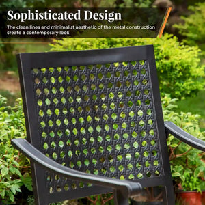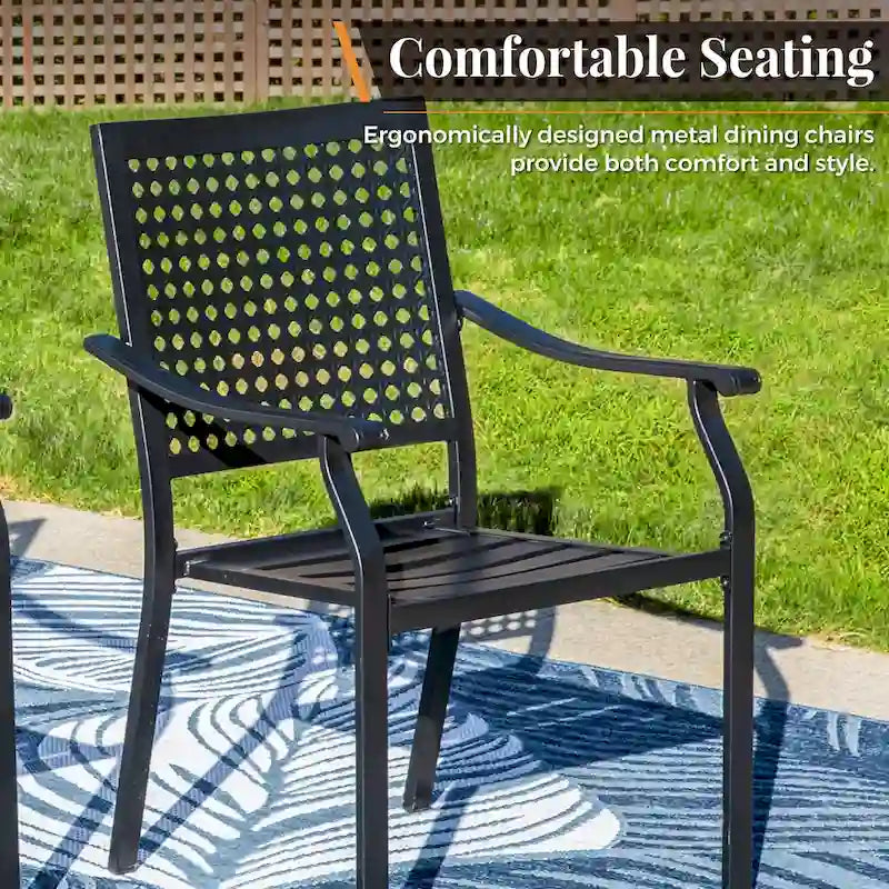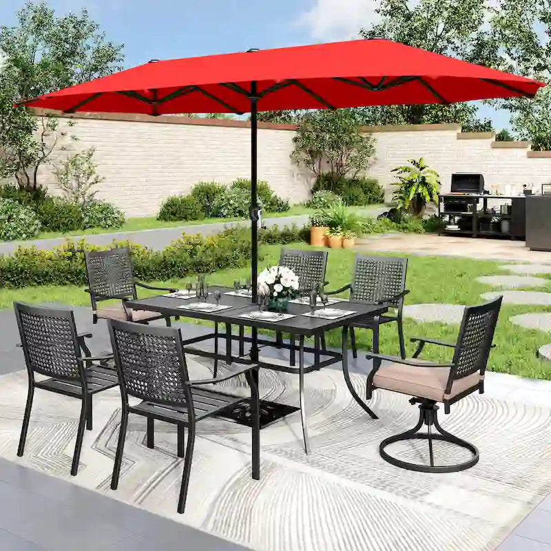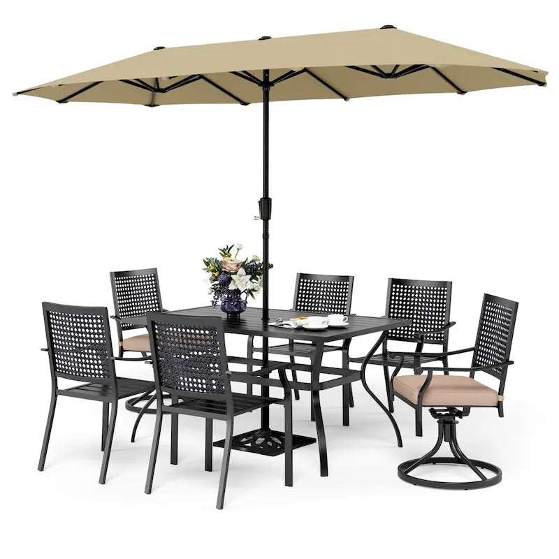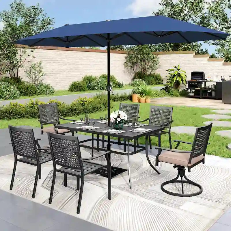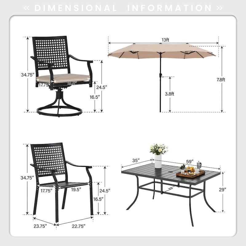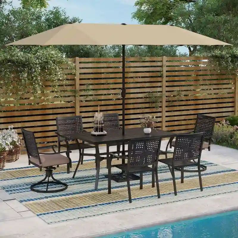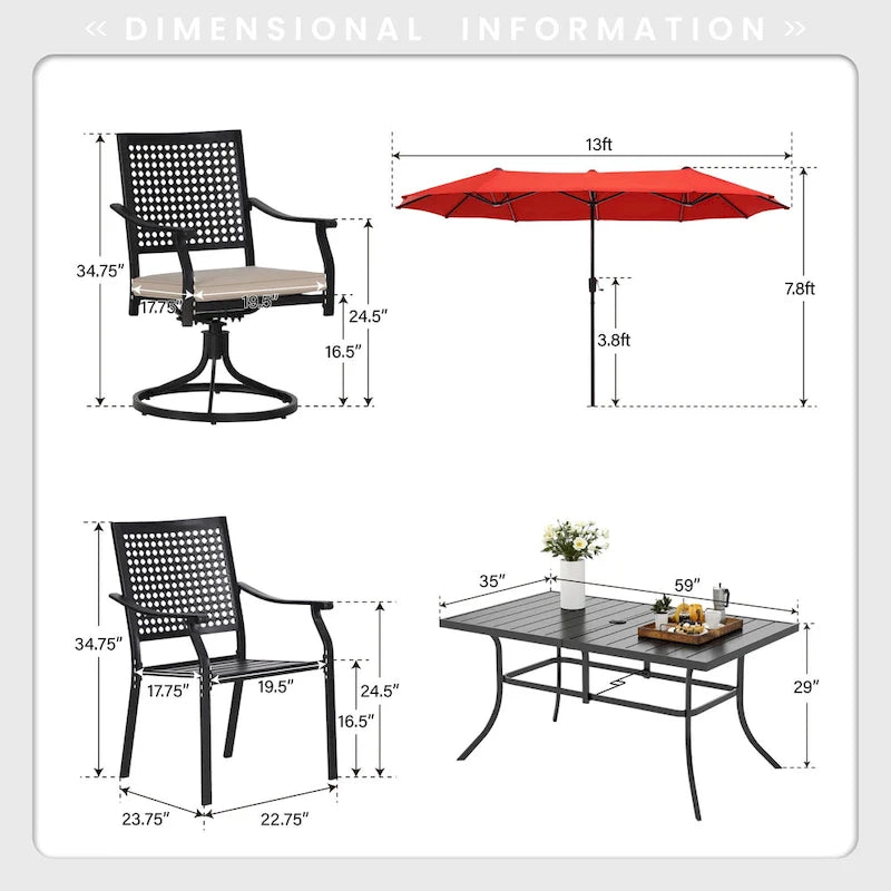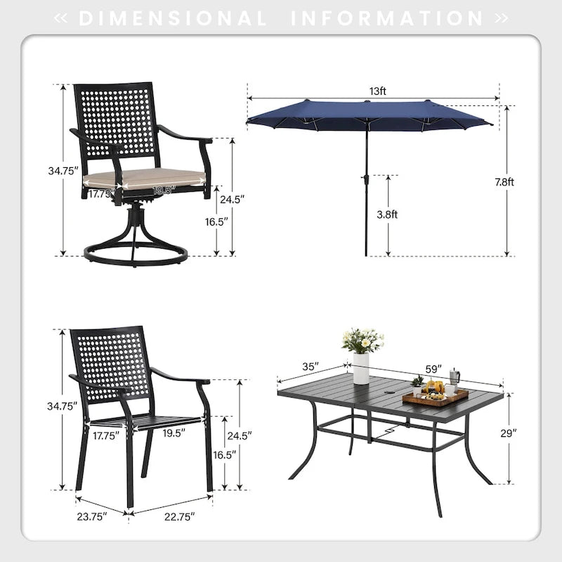 Upgrade your patio with this chic and durable metal Patio Dining Set. The set includes 2 swivel chairs and 4 stackable chairs designed with an upgraded back pattern, a sturdy metal table with an umbrella hole, and a choice of 3 different colors for the patio umbrella. The chairs are processed with e-coating technology for rust and discoloration resistance and have an ergonomic design for maximum comfort. With a weight capacity of 350lbs, this set is suitable for most people.