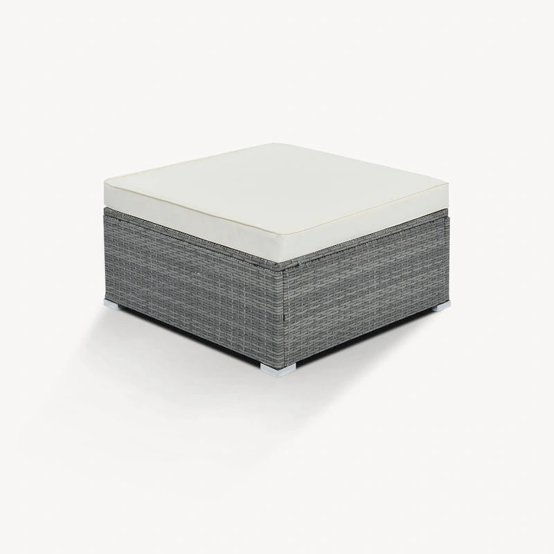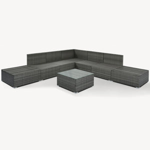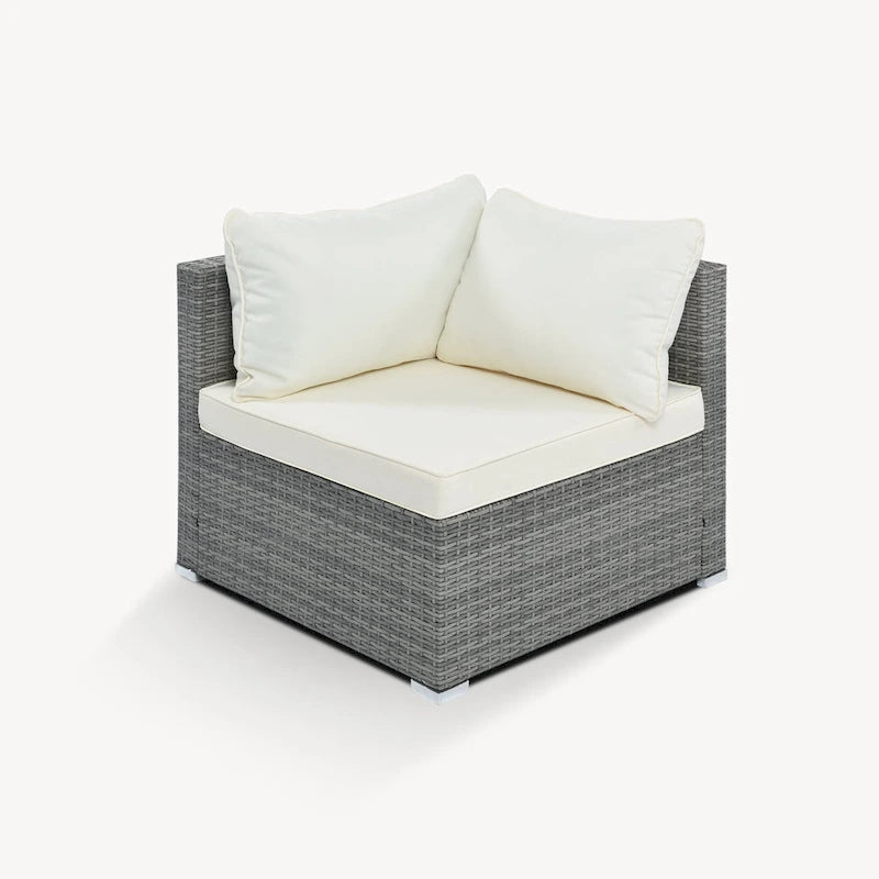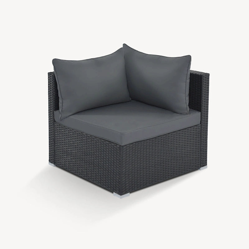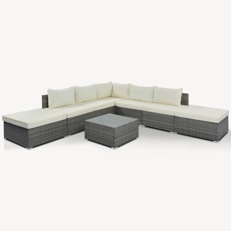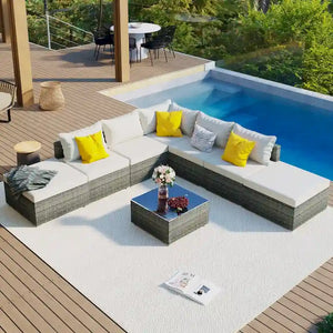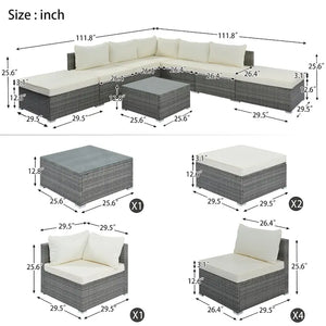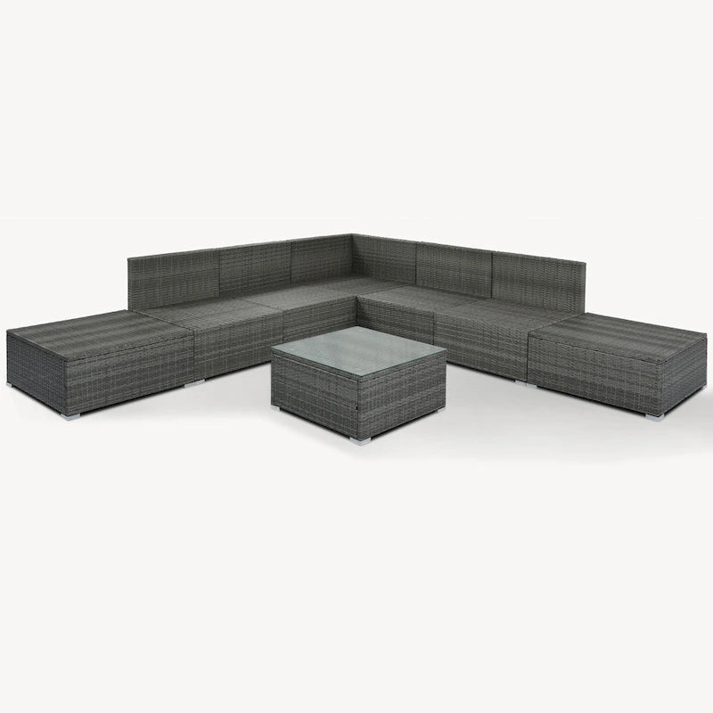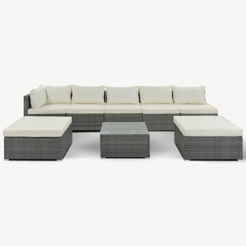 Transform your outdoor space into an oasis with this 8-piece wicker sofa set. Crafted with a sturdy iron frame and top-quality wicker, this set includes 1 corner sofa, 4 single sofas, 2 ottomans, and 1 coffee table. The gray handwoven wicker adds a comfortable and natural texture while the thick cushions and pillows provide ultimate relaxation. With high UV and water resistance, this set is built to last. The non-slip plastic feet and rhombus iron frame structure enhance stability and safety, while the free combination feature allows you to create your own unique arrangement. Cleaning is a breeze with waterproof and corrosion-proof polyester fabric cushions and tempered glass tabletop. This set is perfect for outdoor living and can seat up to 8 people. An installation tutorial and all necessary tools are included.