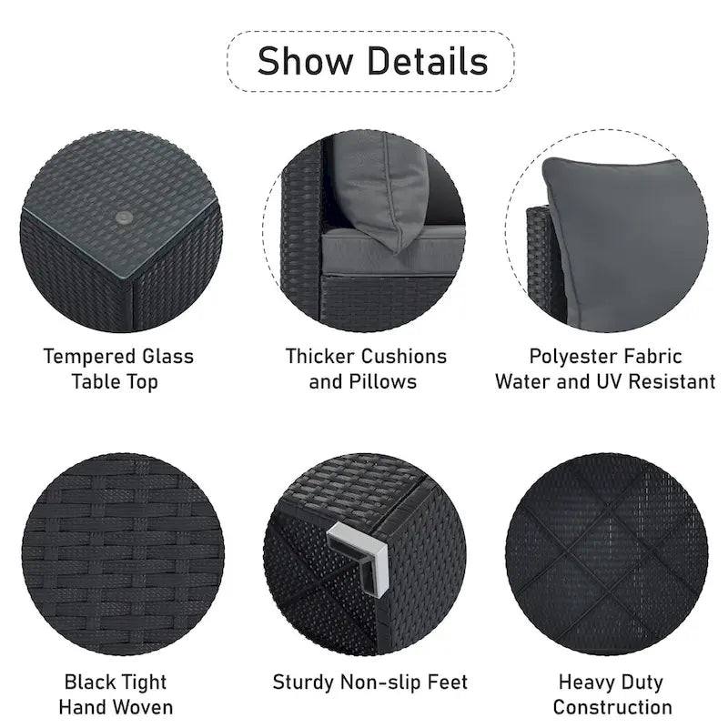 - Material: PE Wicker + Steel frame + Glass + Sponge