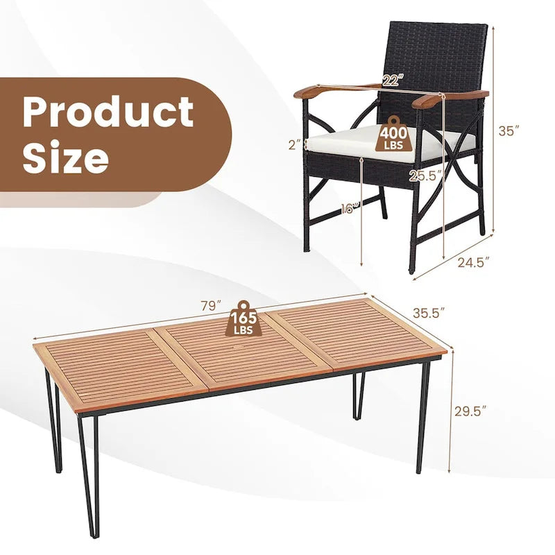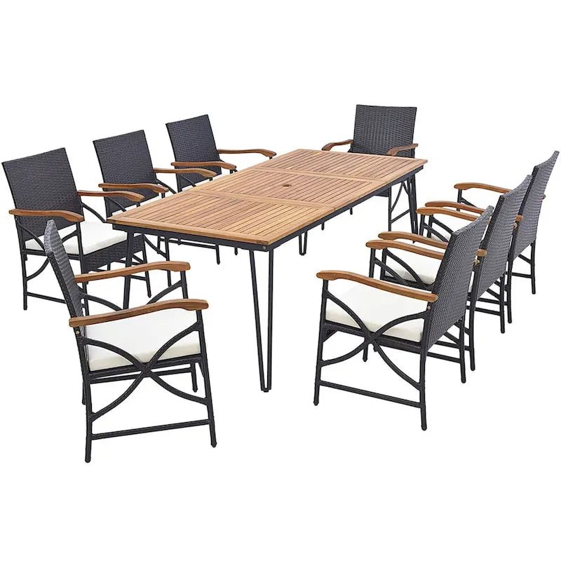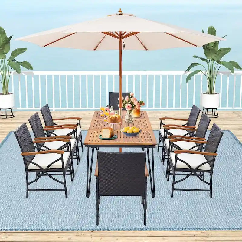 This 9-piece patio dining set includes 1 rectangular dining table and 8 dining armchairs that is perfect for your backyard, poolside or garden. Crafted from solid acacia wood, fade-resistant PE rattan and heavy-duty metal frame, this patio table and chairs set ensures better outdoor performance while making your space look more beautiful. Apart from offering ample space for delicious food, this rectangular tabletop is designed with a 1.9 umbrella hole, facilitating you to add a touch of shade on sunny days. This patio table and chairs set allows chairs to be neatly tucked under the table, which optimizes your outdoor space, maintaining the set's aesthetic appeal and ensuring your space remains uncluttered.