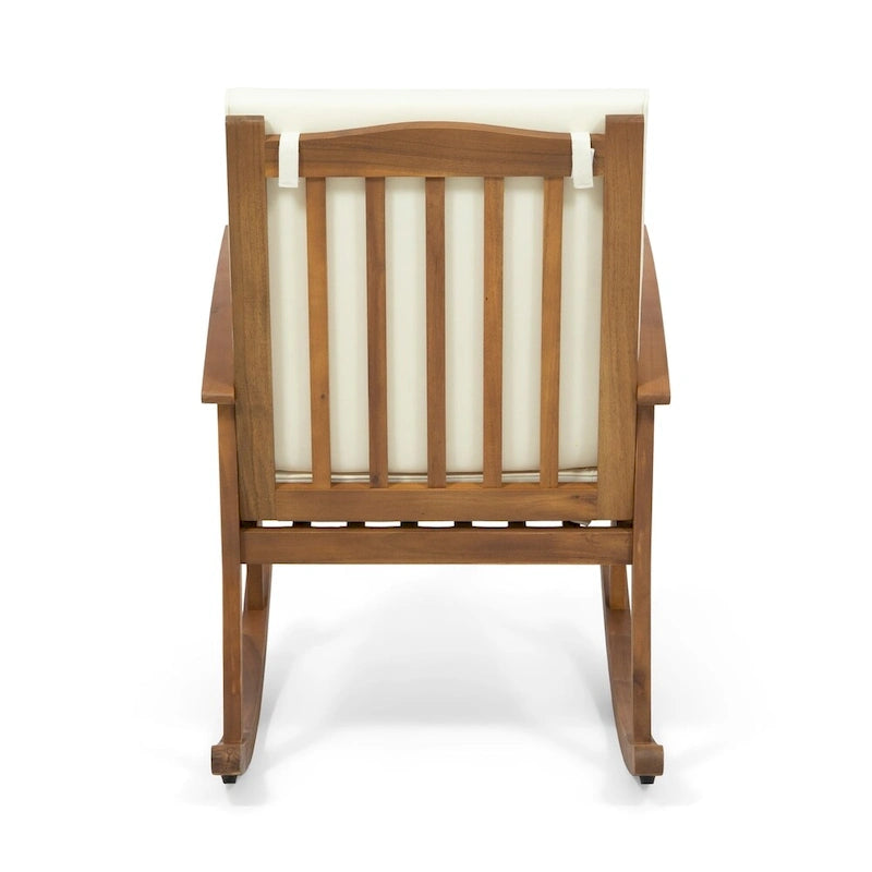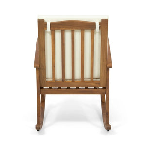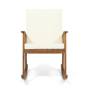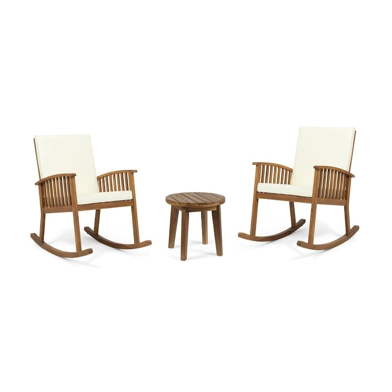 Take in the colors of a gorgeous evening sunset with a loved one by using our delightful rocking chair and side table set. Featuring a gorgeous acacia wood frame with back and seat cushions, this set brings both incredible comfort and a homey vibe to your outdoor space. This set is finished with a gentle rocking design that creates a soothing motion for you to enjoy, allowing you to easily place this set in a cozy corner for well-deserved relaxation.