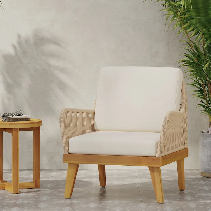 Take relaxation to the next level with a perfect blend of comfort and style. Our club chair uses both a modern design and a rich acacia wood frame to create the perfect addition to any backyard lounge space. Featuring cozy cushions and rope weave accents, our chair is made to give your home an eye-catching upgrade in decor as well as a boost in al fresco entertainment.