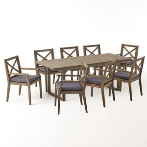 Make the most out of your outdoor space with our delightful dining set that makes hosting parties a breeze. Made from acacia wood, this set offers a highly durable structure that also provides a simple yet attractive rustic look for any backyard or patio space. With an expandable table and eight dining chairs, this set is perfectly convenient for accommodating unexpected guests. This set is complete with weather-resistant cushions and a delightful classic slat motif, making this set the ideal addition to your outdoor decor.