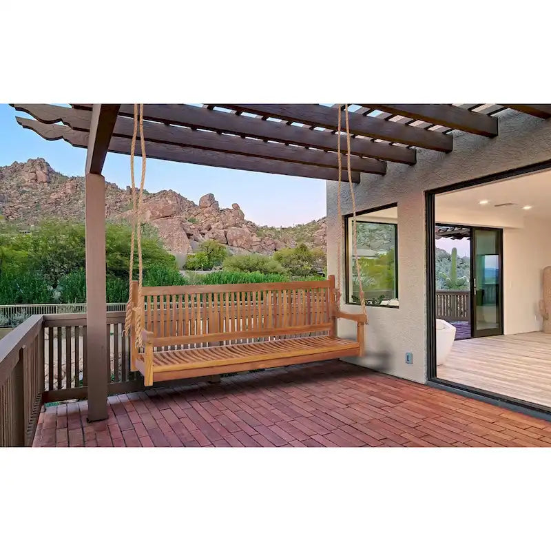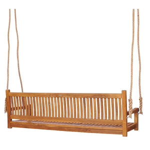 The classic design of our Teak ElzasTriple Swing brings simple sophistication to the unmatched quality and splendor of teak wood. The Elzas Collection's uncomplicated design makes it a welcome addition to any setting, bringing all the comforts of home outdoors. The curved design of this teak bench makes it exceedingly comfortable with or without a cushion. You'll love the design and stunning honey-brown wood grains found in our teak wood.
