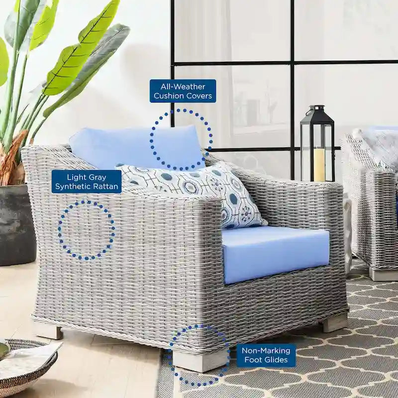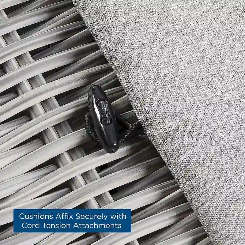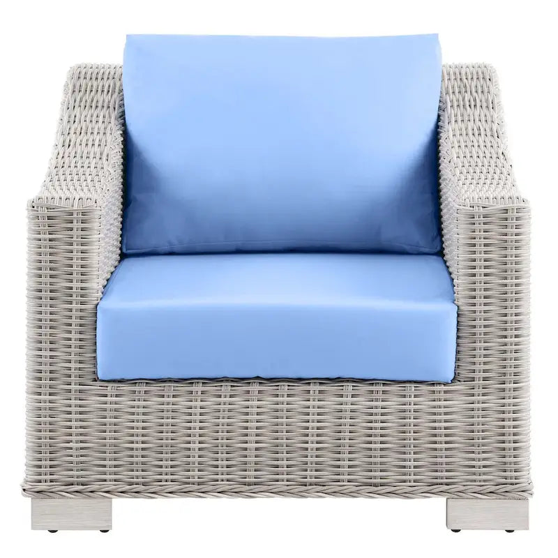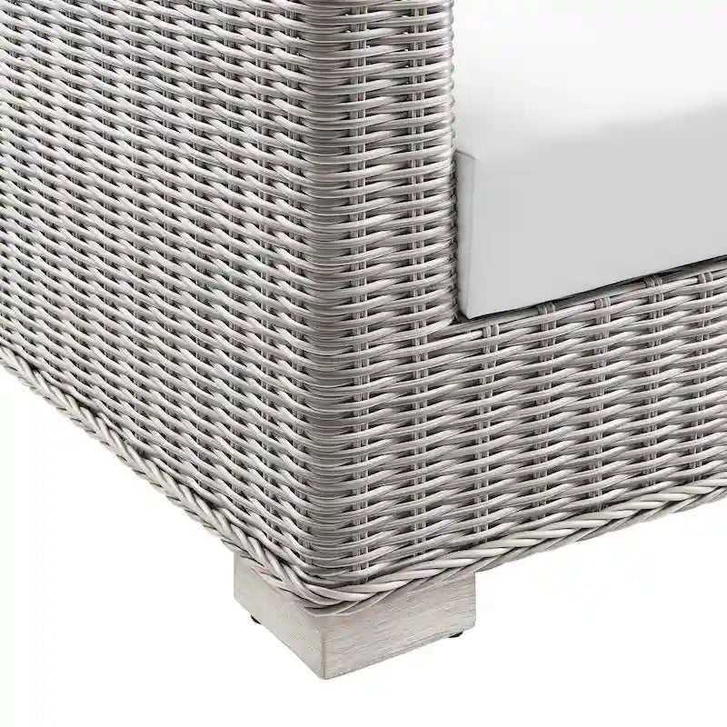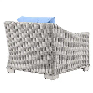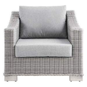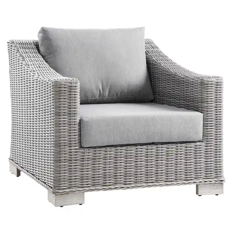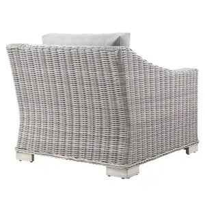 The Conway Outdoor Patio Wicker Rattan Armchair adds a classic and trendy touch to any outdoor space. This chair is wrapped in UV-resistant light gray synthetic wicker rattan for organic texture and features a durable powder-coated aluminum frame resting on L-shaped legs with plastic foot glides. The thick foam padded cushions are covered with removable, water-resistant polyester covers and affix securely to the lounge chair with cord tension attachments. This comfy and stylish armchair can hold up to 300 lbs and requires assembly.