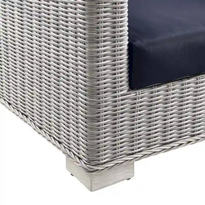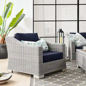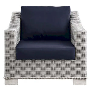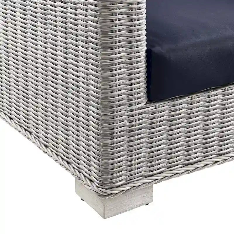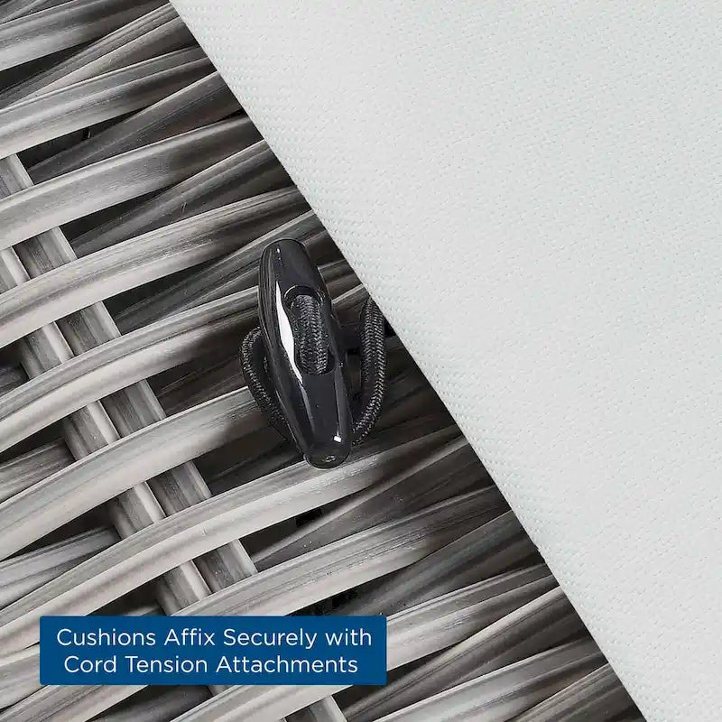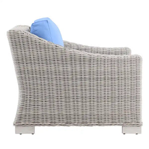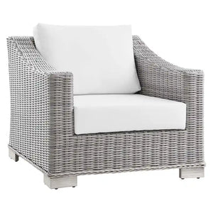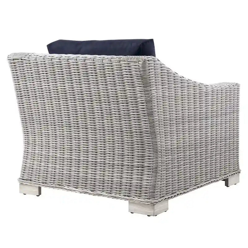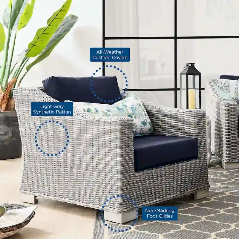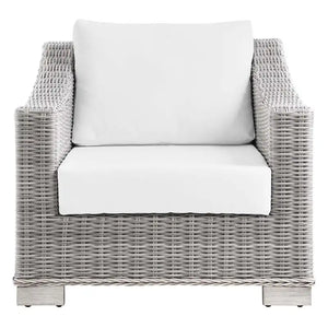 The Conway Outdoor Patio Wicker Rattan Armchair adds a classic and trendy touch to any outdoor space. This chair is wrapped in UV-resistant light gray synthetic wicker rattan for organic texture and features a durable powder-coated aluminum frame resting on L-shaped legs with plastic foot glides. The thick foam padded cushions are covered with removable, water-resistant polyester covers and affix securely to the lounge chair with cord tension attachments. This comfy and stylish armchair can hold up to 300 lbs and requires assembly.