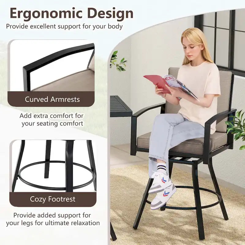 The counter height bar stools, with their full 360 swivel capability, include cozy armrests and footrests, ensuring comfort from every angle. Additionally, the soft padded cushions offer a soft seat and back support for prolonged relaxation. Built with a sturdy metal frame, each stool can support up to 400 lbs and the table up to 180 lbs, making this patio bar set both long-lasting and stable. Moreover, the square bar table is thoughtfully fitted with a 1.57 umbrella hole with a securing fixture, providing the convenience of shade on sunny days.