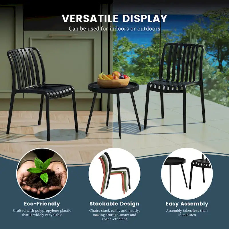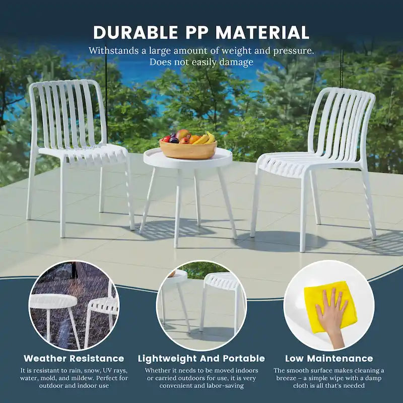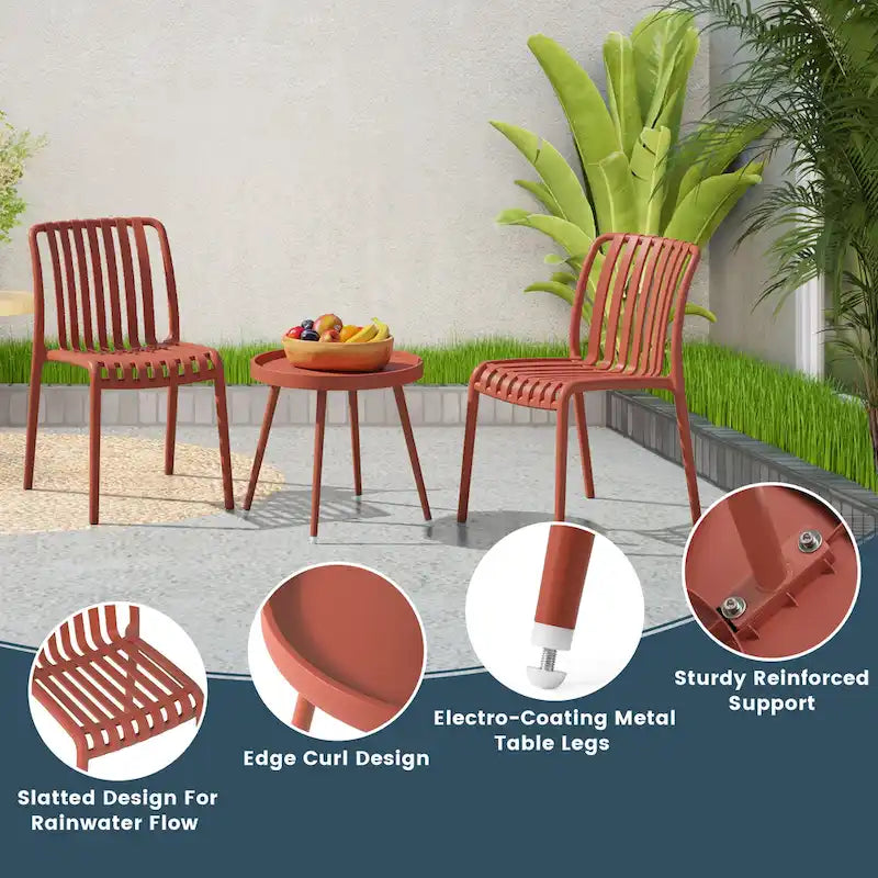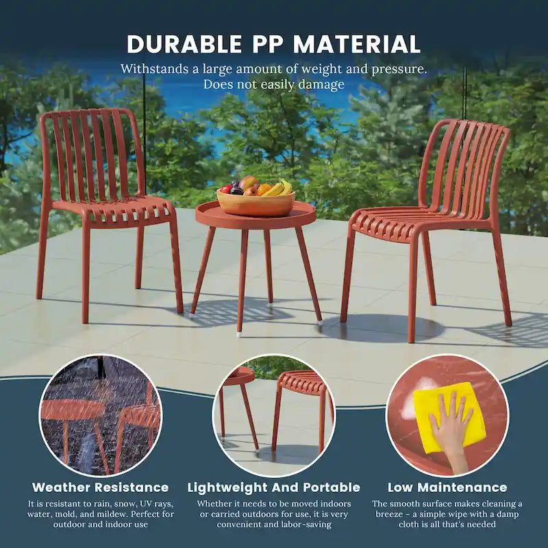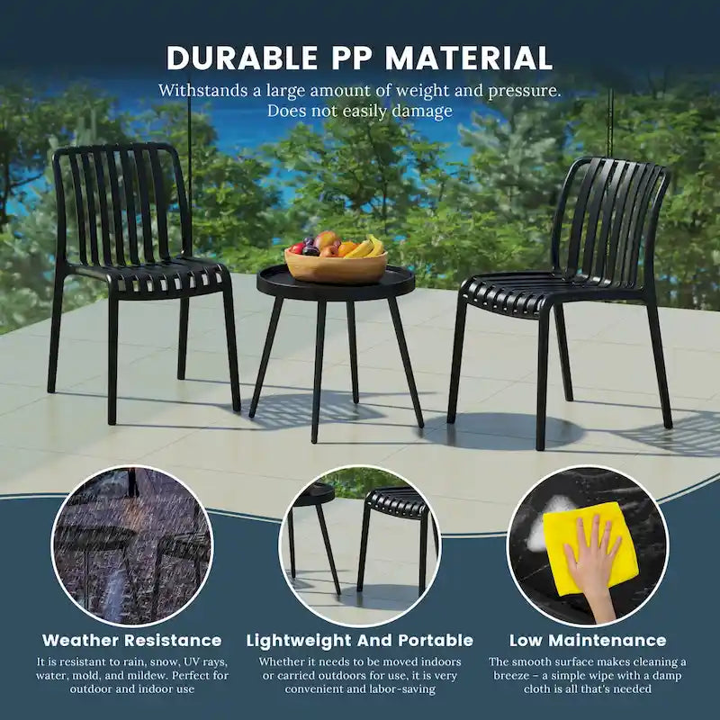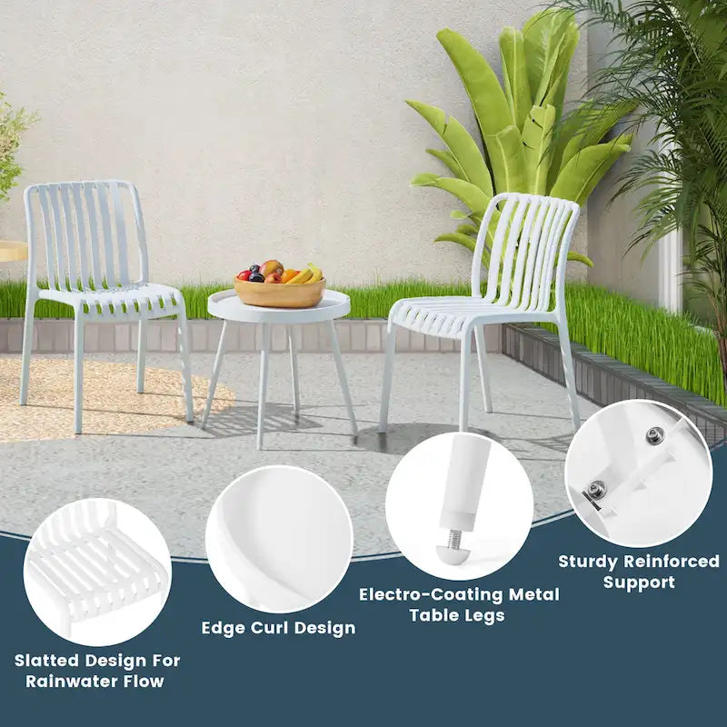 Brighten your outdoor space with this modern 3-piece patio furniture set. It features a durable 18.5 round table with a polypropylene tabletop, a fade- and e-coated rust-resistant iron frame for added protection against rust, and adjustable leveling feet for stability to prevent wobbling on uneven floors. Also included are two stackable, UV- and fade-resistant polypropylene (PP) resin patio chairs with slatted lines designed to improve airflow and keep you cool on warmer days, while also allowing water to drain through to prevent puddling. The chairs also have rubber foot pads to protect your floors and add extra stability. The patio chairs require no assembly and are ready right out of the box, and the table requires simple leg assembly, making this small patio set ready to use in minutes
