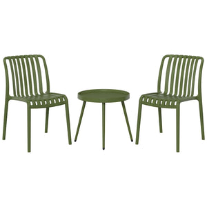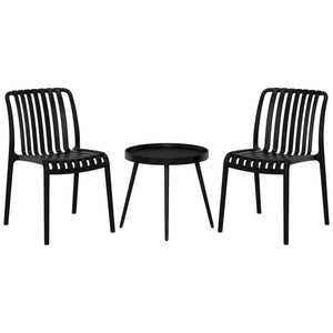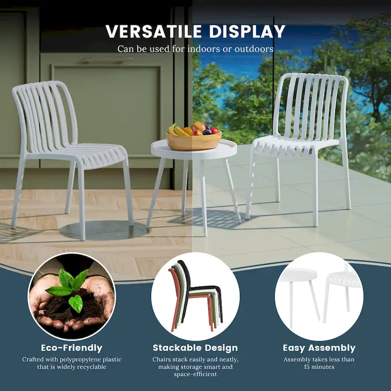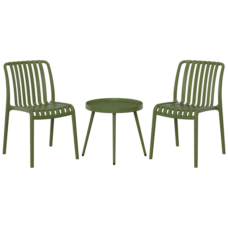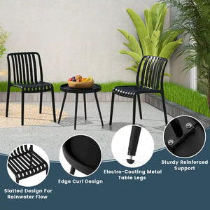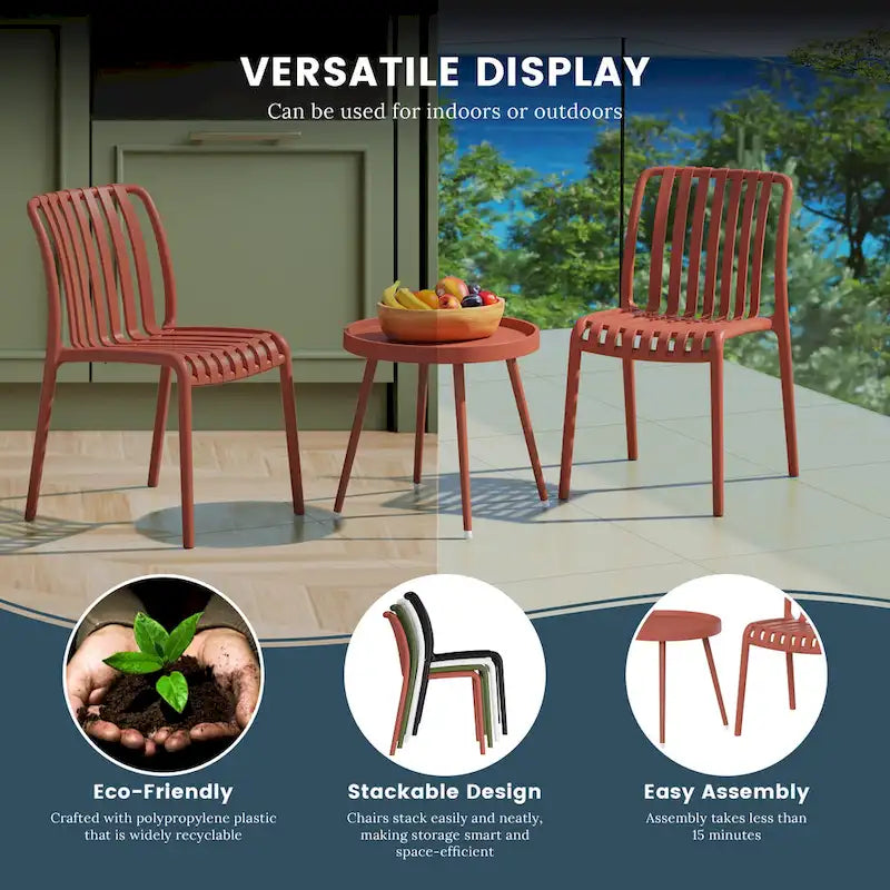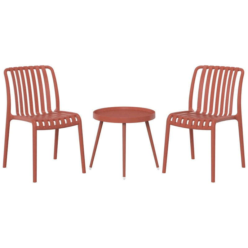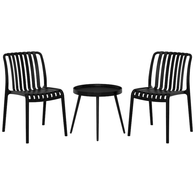 Brighten your outdoor space with this modern 3-piece patio furniture set. It features a durable 18.5 round table with a polypropylene tabletop, a fade- and e-coated rust-resistant iron frame for added protection against rust, and adjustable leveling feet for stability to prevent wobbling on uneven floors. Also included are two stackable, UV- and fade-resistant polypropylene (PP) resin patio chairs with slatted lines designed to improve airflow and keep you cool on warmer days, while also allowing water to drain through to prevent puddling. The chairs also have rubber foot pads to protect your floors and add extra stability. The patio chairs require no assembly and are ready right out of the box, and the table requires simple leg assembly, making this small patio set ready to use in minutes