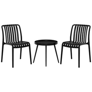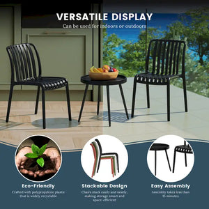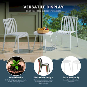 - Set Includes: Two (2) Plastic Resin Patio Chairs and One (1) 19.5 Round Patio Side Table