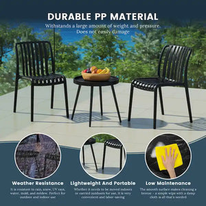 - Crafted with durable materials: Side table crafted out of strong iron frame and polypropylene resin top; durable polypropylene (PP) chairs