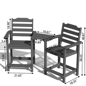 Enhance your outdoor seating area with our stylish HDPE Bar Chair Set, featuring two elegantly designed chairs and a connecting table. Made from high-density polyethylene (HDPE), these chairs are not only weather-resistant but also built to last. The sleek and modern design of the chairs, combined with the practicality of the connecting table, which includes an umbrella hole for added convenience, makes this set a perfect choice for any patio or deck. The ergonomic features, such as armrests and a footrest, provide comfort for extended periods, while the easy-to-clean surface ensures low maintenance. Enjoy your outdoor space with a set that combines functionality with contemporary aesthetics.