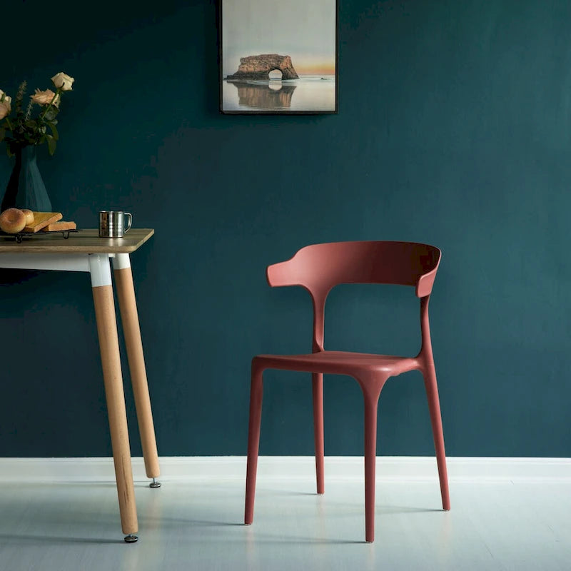 Upgrade your dining experience with this sleek and durable Modern Plastic Outdoor Dining Chair. Made entirely from molded polypropylene plastic, this single-piece chair offers a comfortably contoured U-shaped backrest. Its stackable design makes it easy to store when not in use. Suitable for both indoor and outdoor settings, this chair comes in blue, grey, or red and is available as a single chair, a set of 2, or a set of 4.
