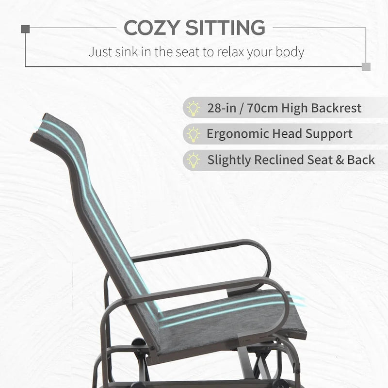 - Cozy Glider Chair: Our single-person outdoor glider features a 28-inch-high backrest and ergonomically protruding neck support, providing your upper body extra comfort.