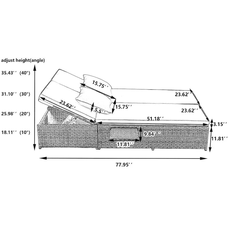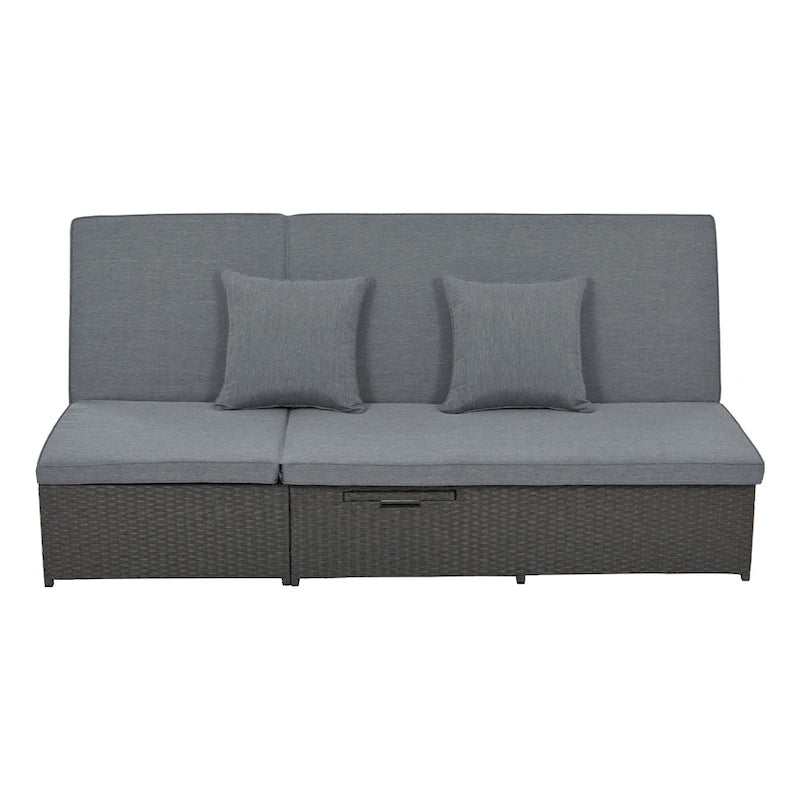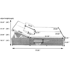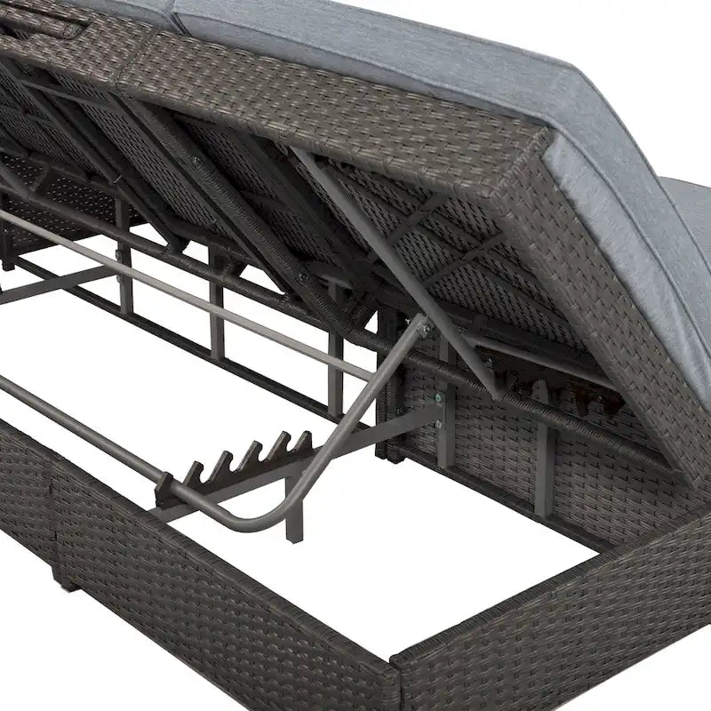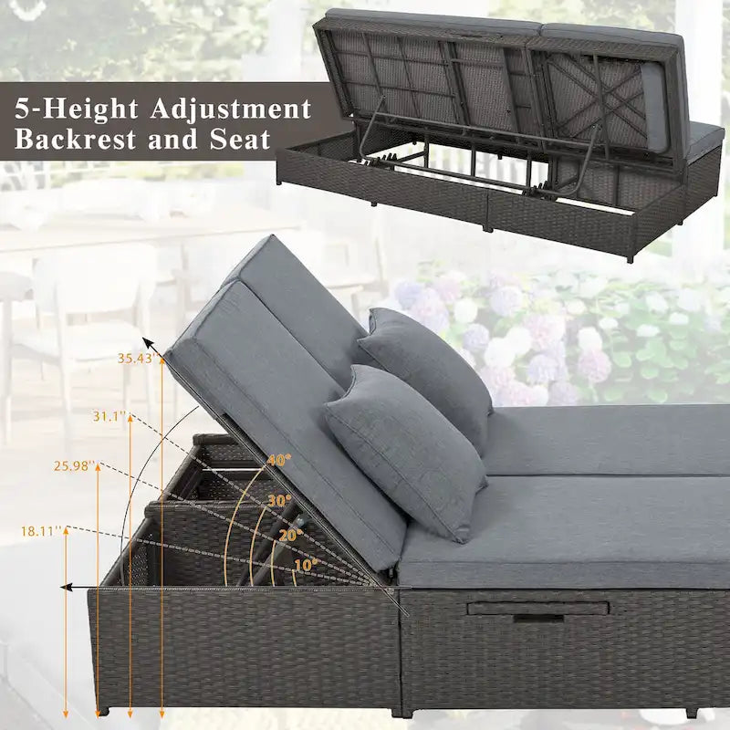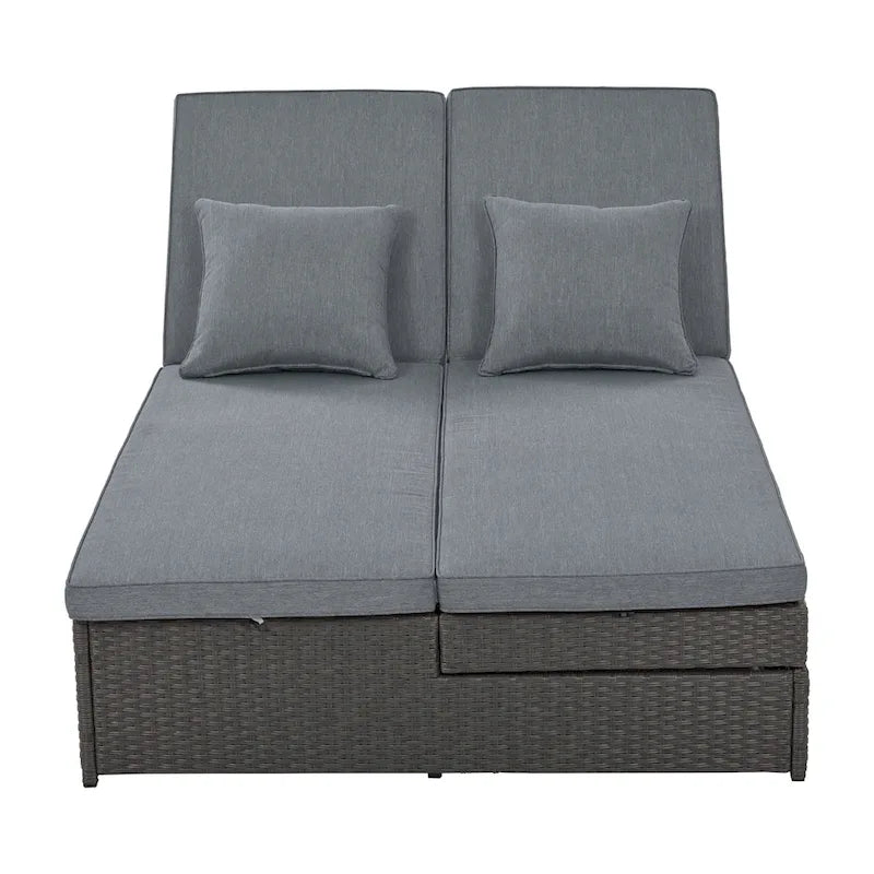 Outdoor Gray Wicker Double Chaise Lounge with Adjustable Backrest