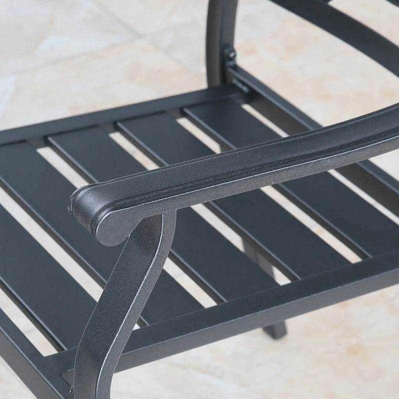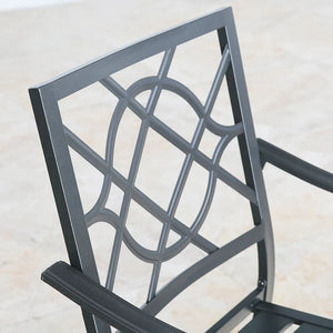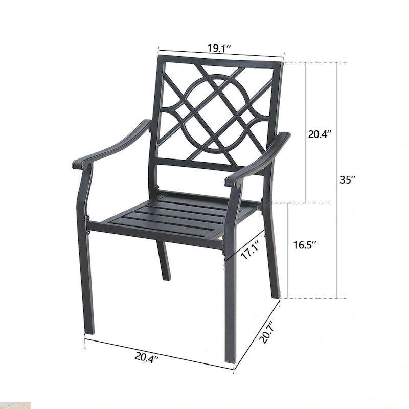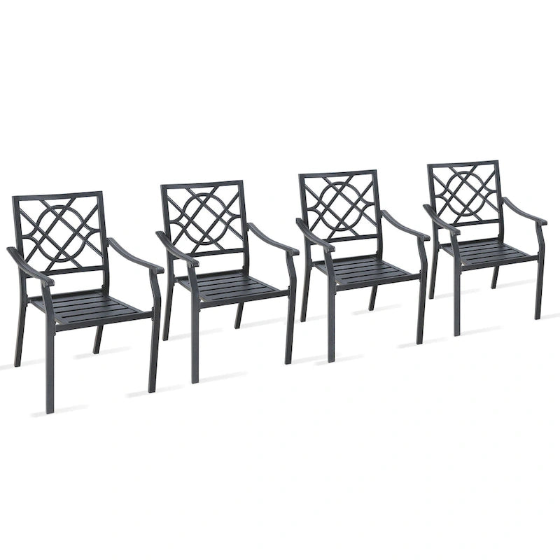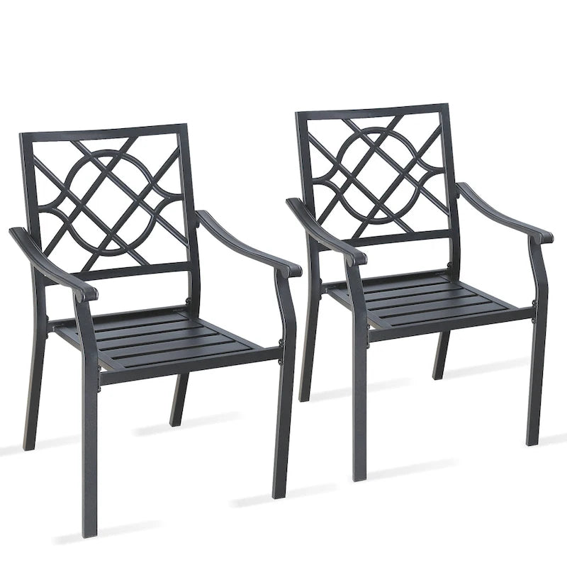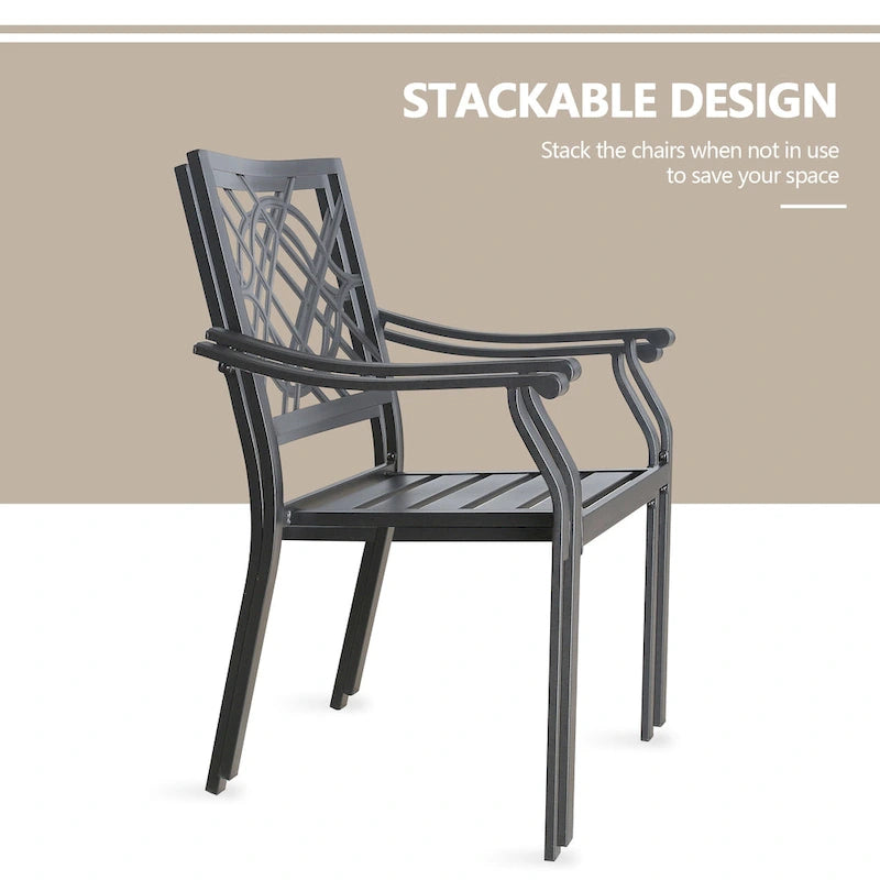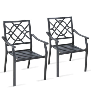 These stylish and elegant patio dining chairs feature a powder-coated steel frame for enhanced durability and rust-resistance. The ergonomic design includes a slatted steel seat, curved backrest and armrest for added support and comfort. The unique woven pattern design of the back provides an aesthetic touch to your outdoor space. Perfect for your garden, porch, backyard and balcony!