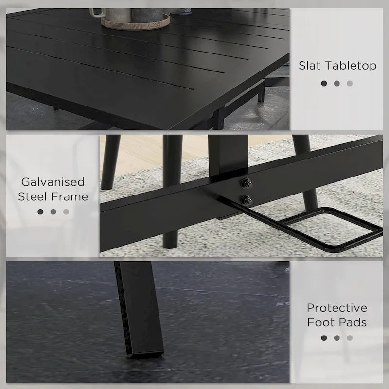 - Slatted Steel Garden Table: Our outdoor patio table offers a slatted build with a classic look that prevents water buildup. Patio, porch, or poolside, our table is an easy accent outsideafter the rain, it's easy to wipe and drain.
