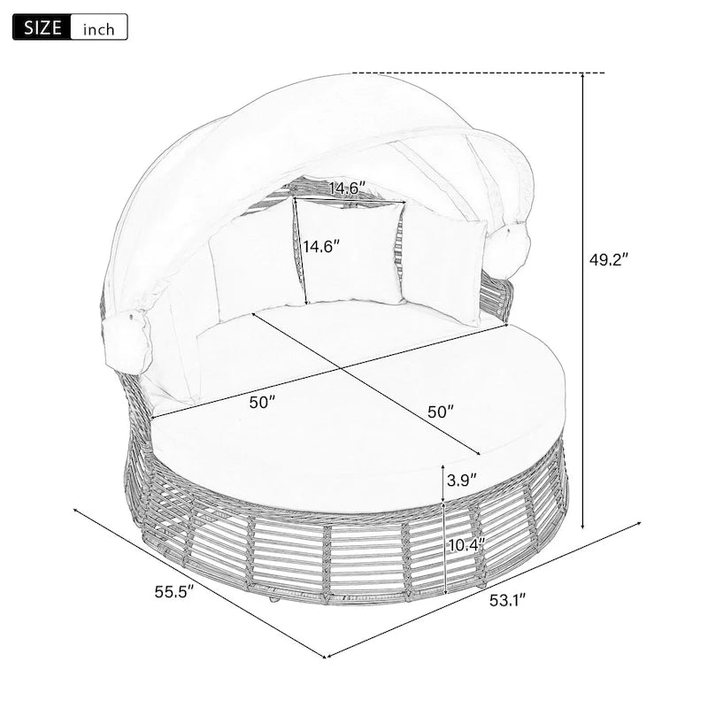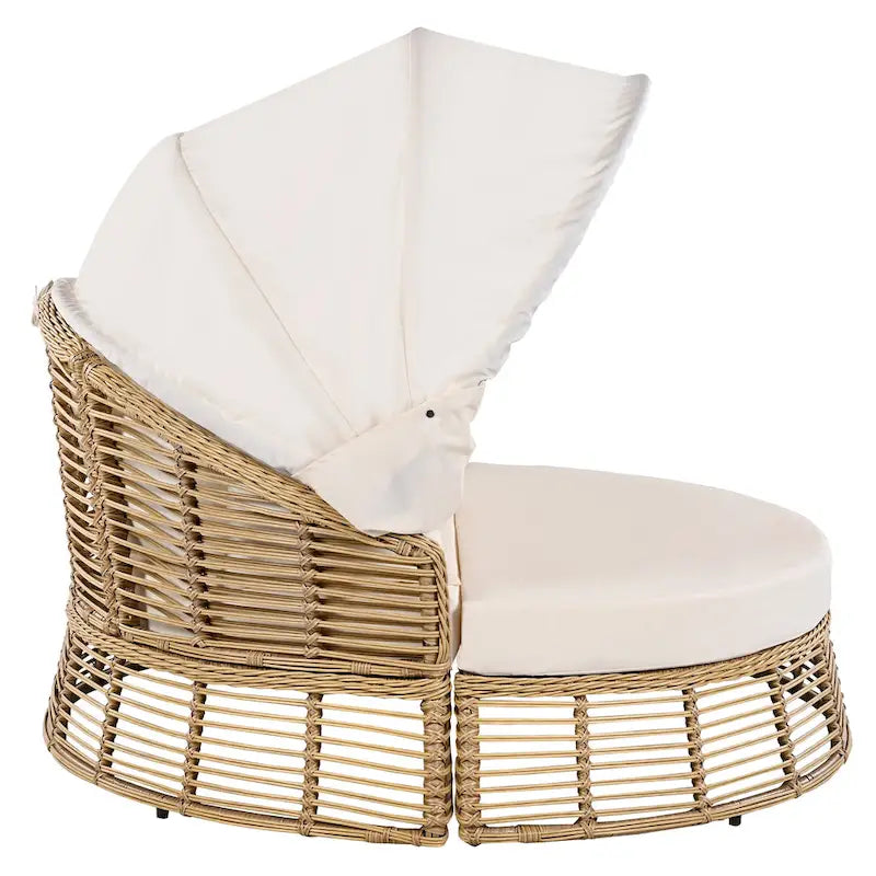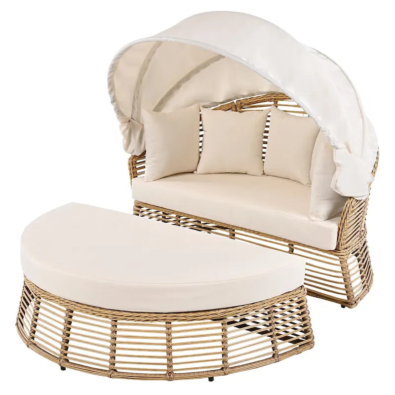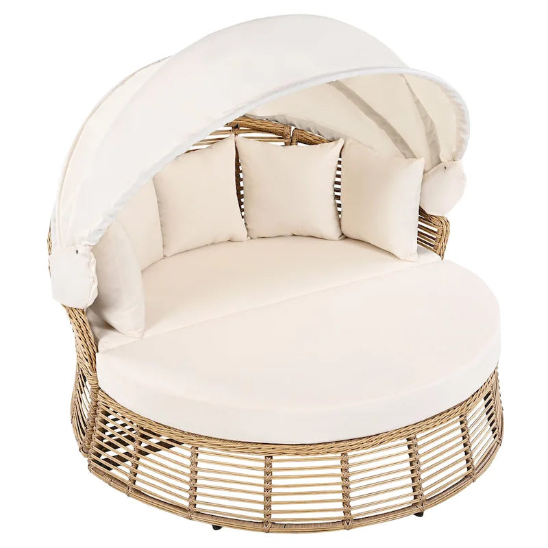 Roomfitters Outdoor Round Daybed, Patio Wicker Sofa with Retractable Canopy & Removable Cushions, Backyard & Porch, Beige