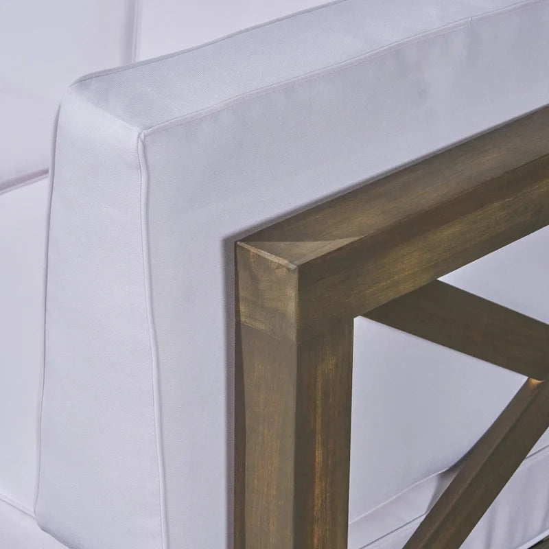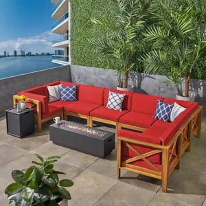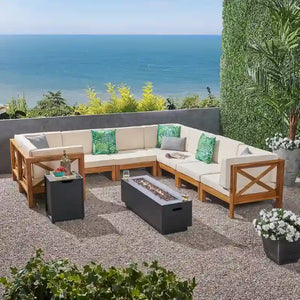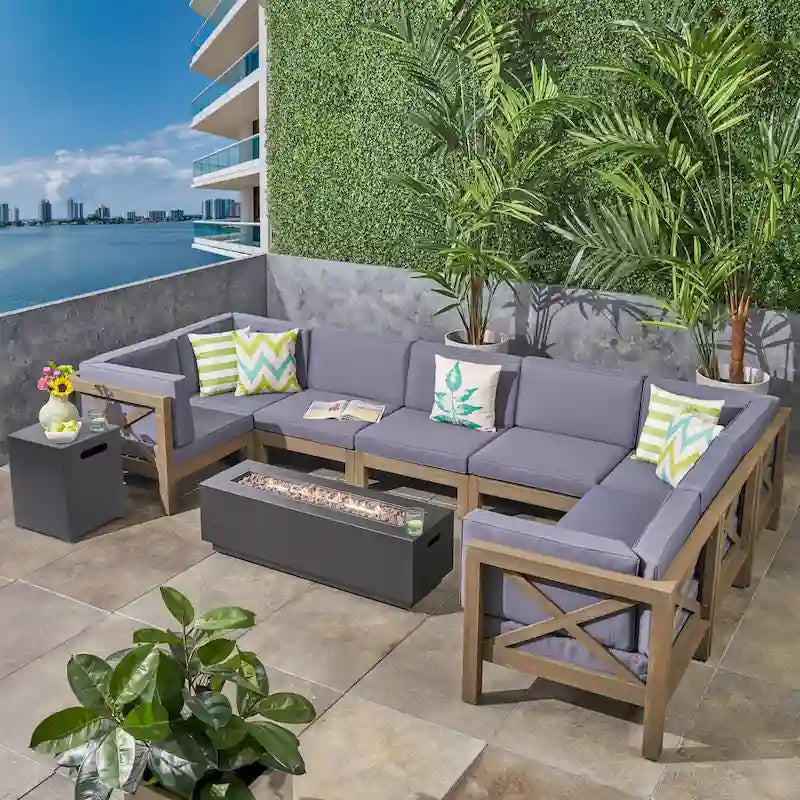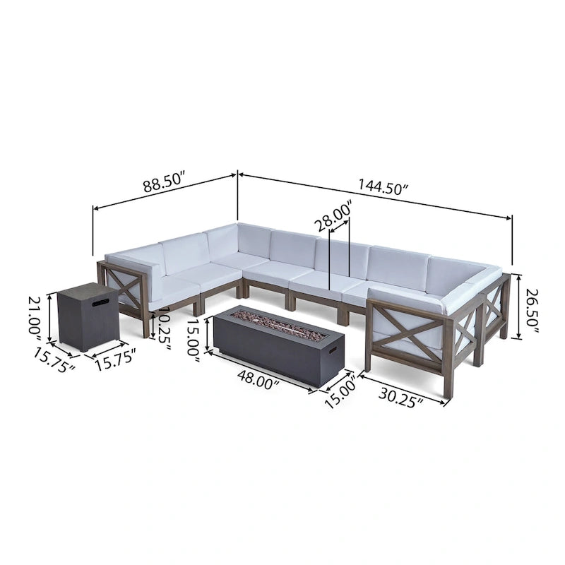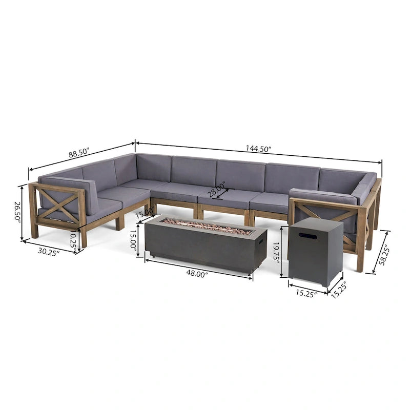 Don't leave your guests standing in the dark after the sun goes down. Our 8-seater outdoor sectional sofa and fire pit set will change barbecues and late-night soirees at home forever. This estate collection comes fully outfitted with everything you need to show all of your favorite people the time of their lives, including a fire pit and tank holder, one right-side armchair, one left-side armchair, two corner pieces, and four armless segments. As a fully modular assemblage of outdoor furniture, you have the freedom to customize your configuration to suit your patio or deck's floor plan without limitation.