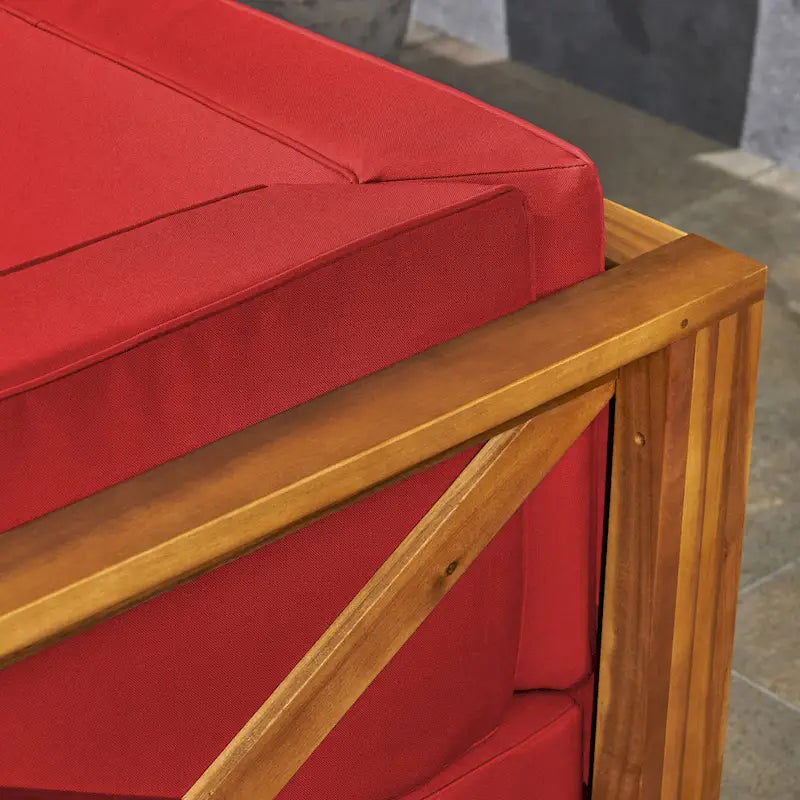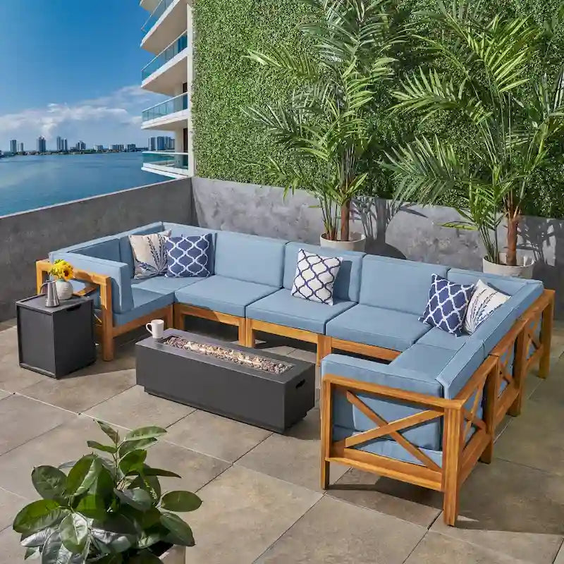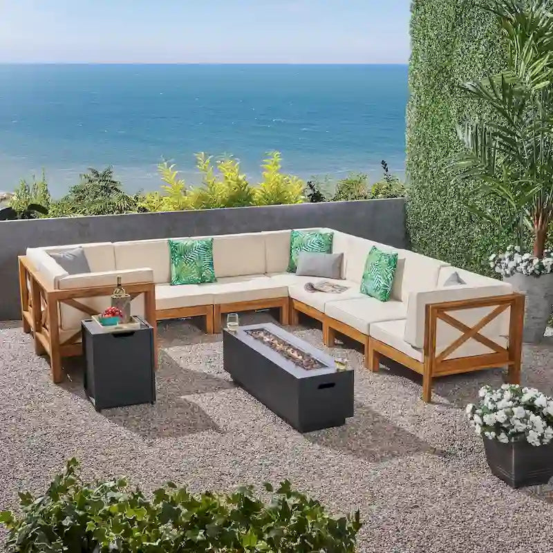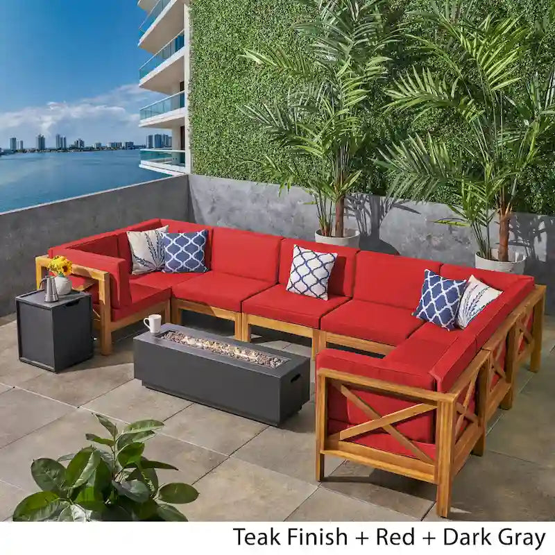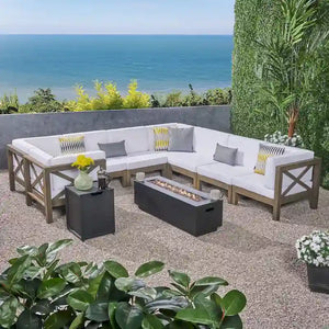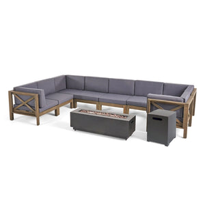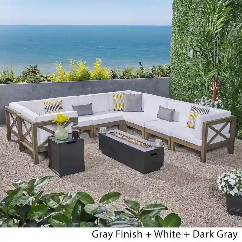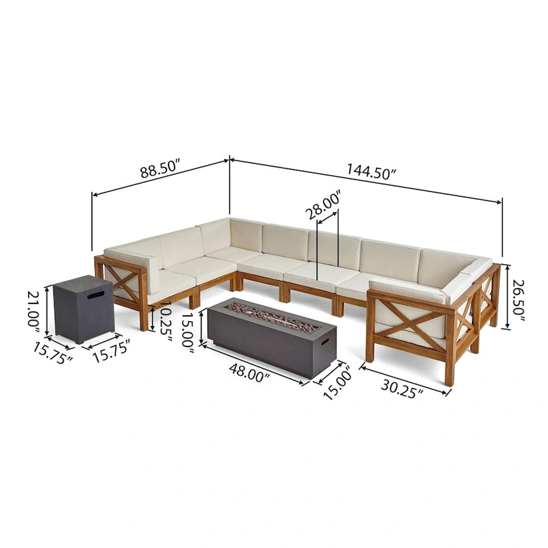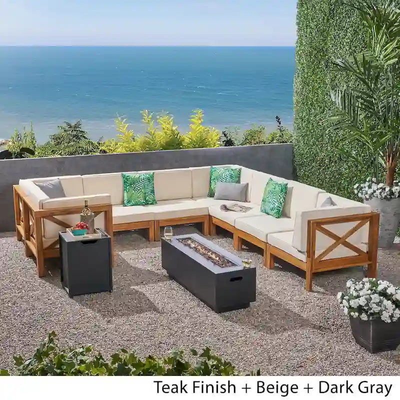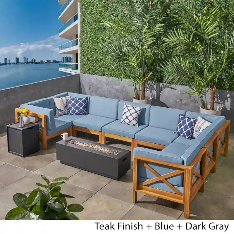 Thasos Outdoor Farmhouse Acacia Wood 8 Seater U-Shaped Sectional Sofa Set with Fire Pit by Christopher Knight Home