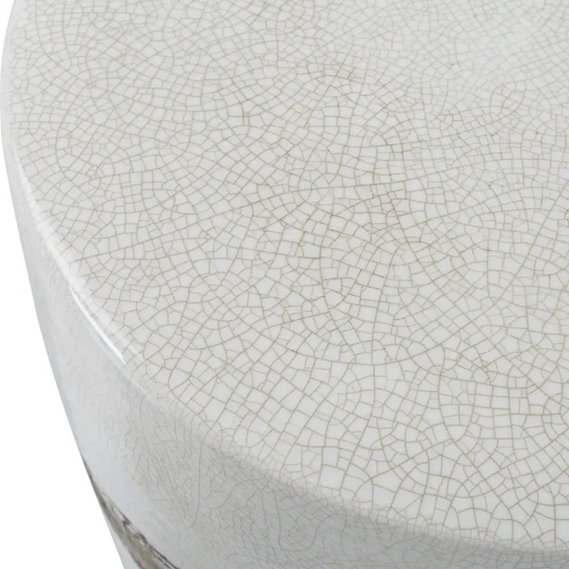 Showcasing a rustic casual look, this ceramic garden stool features an off-white crackle glaze with distressed rust brown details and noticeable ribbed texture. May be used outdoors, but protection from freezing temperatures is recommended.