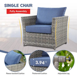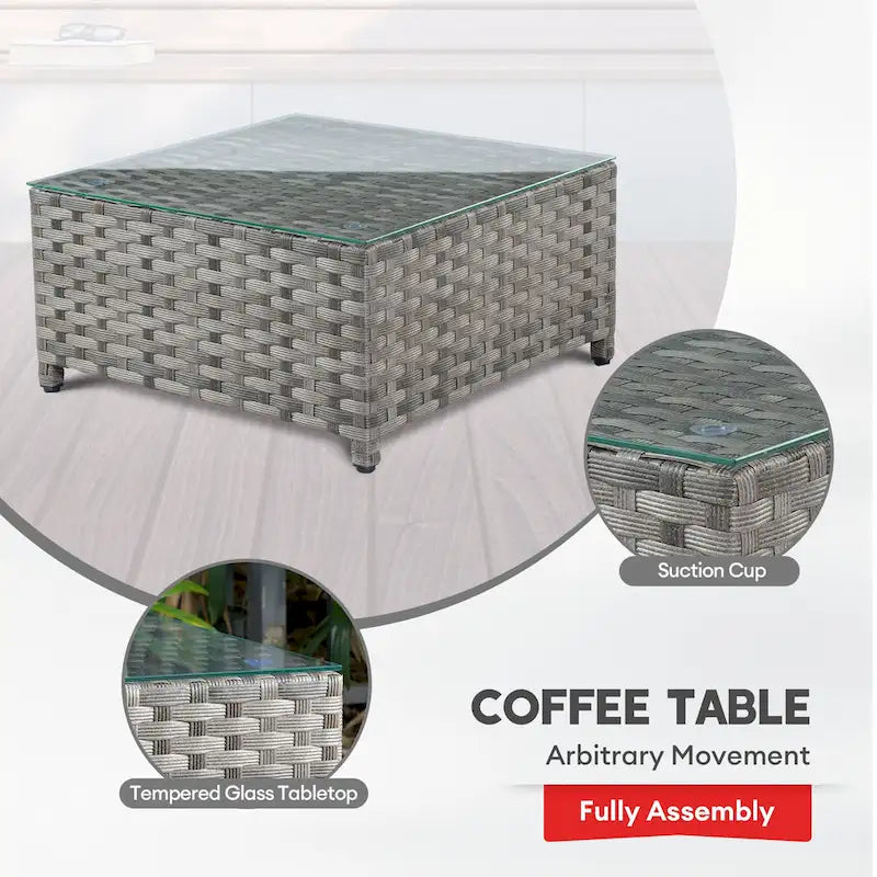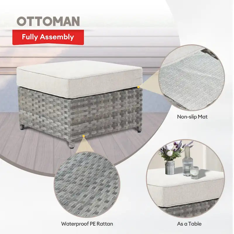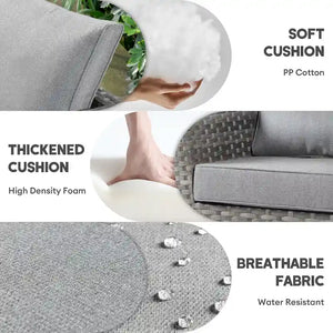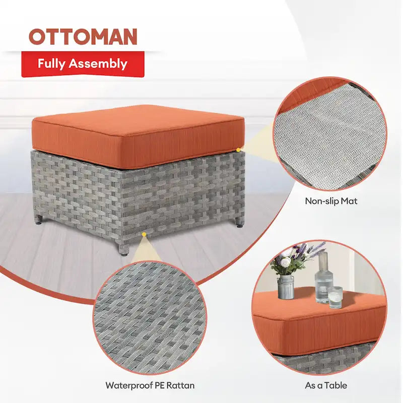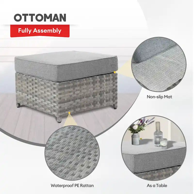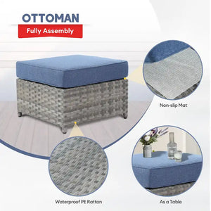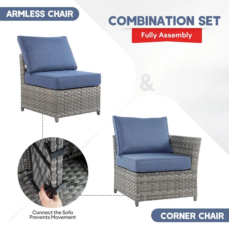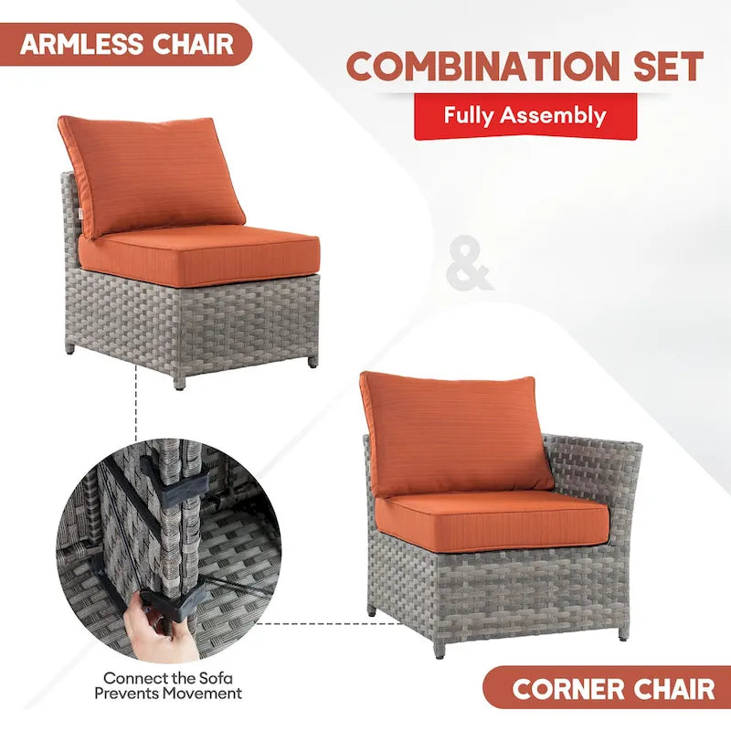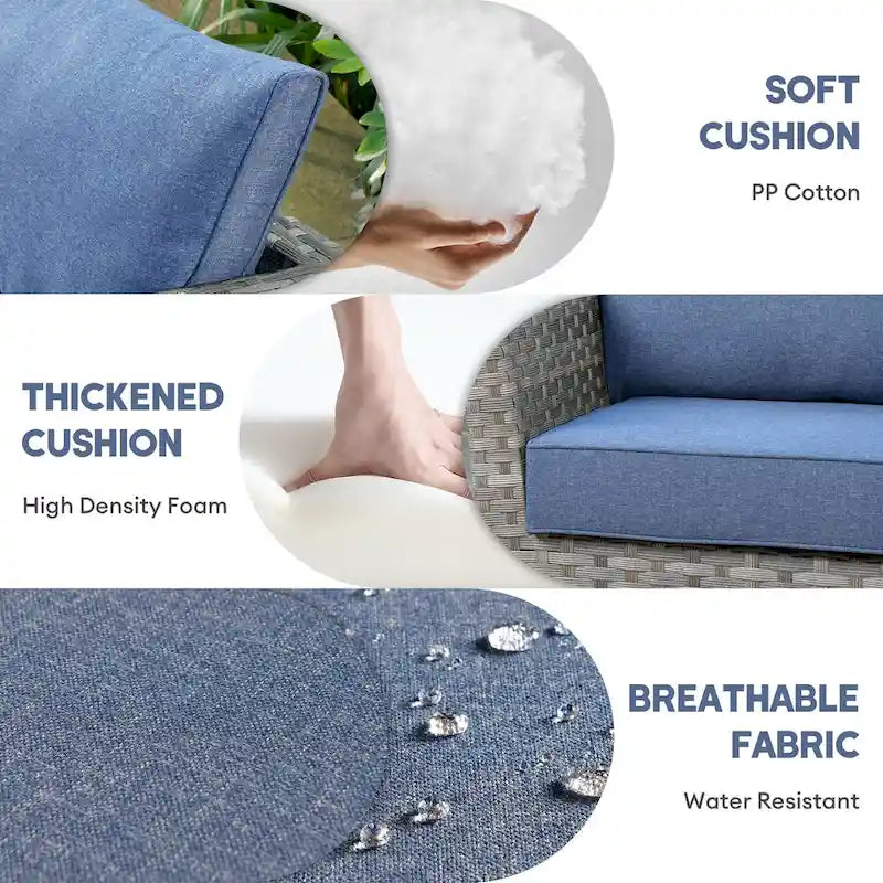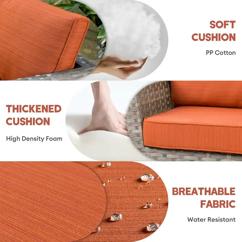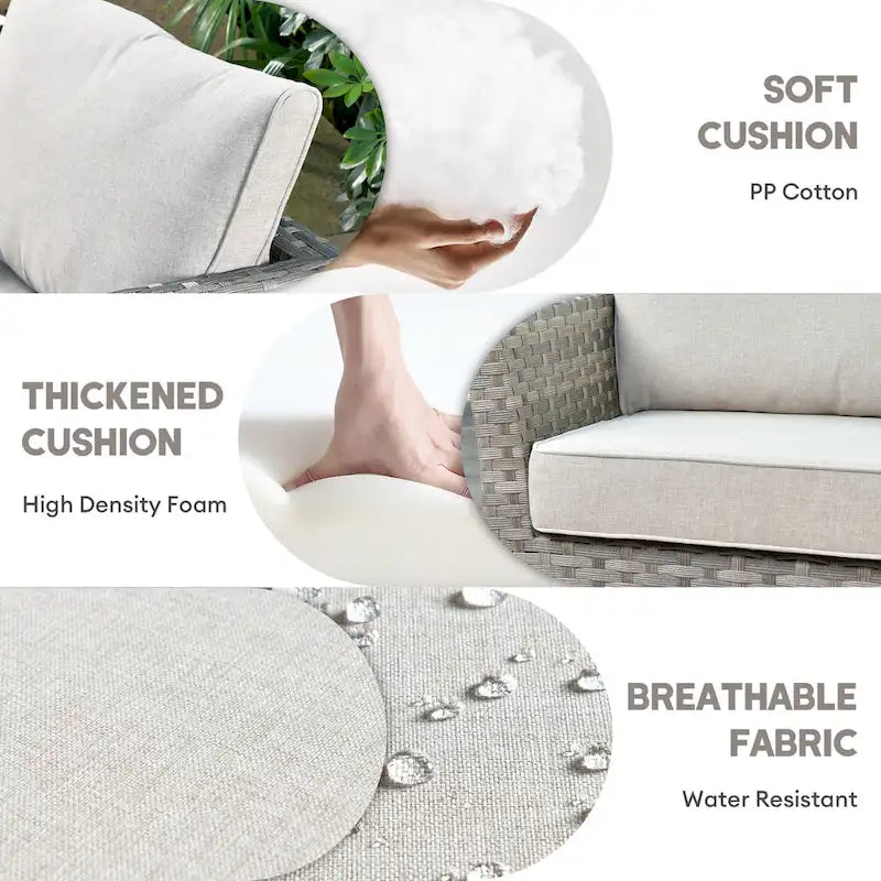 This outdoor furniture sofa set features durable weather-resistant PE wicker and high-density sponge cushions. High quality fabric with good texture wears well and can keep good condition after long time using. High elastic seat cushions can keep a good shape and not easy to deform, provide a comfortable sitting experience. The sectional sofa set can be set up in different shapes according to your own preference and the wicker woven firepit also goes well with this furniture set. An ideal set for patio, backyard, balcony, poolside and garden.